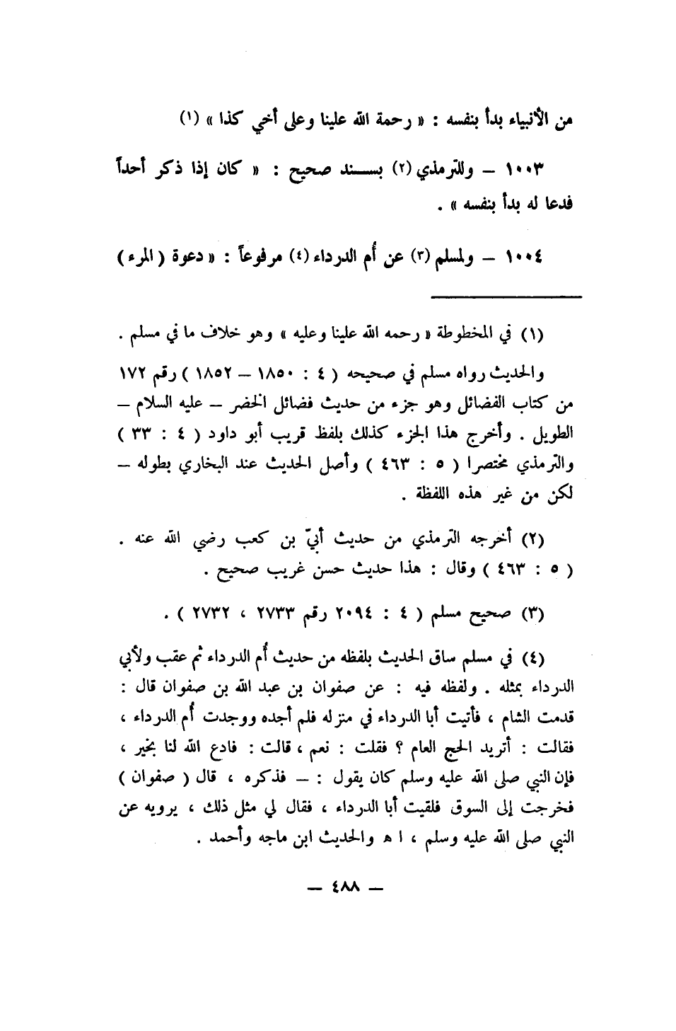 1003- وللتزمذي 2 بسند صحيح: (كان إذا ذكر أحداً فدعا له بدأ بنفسه) .