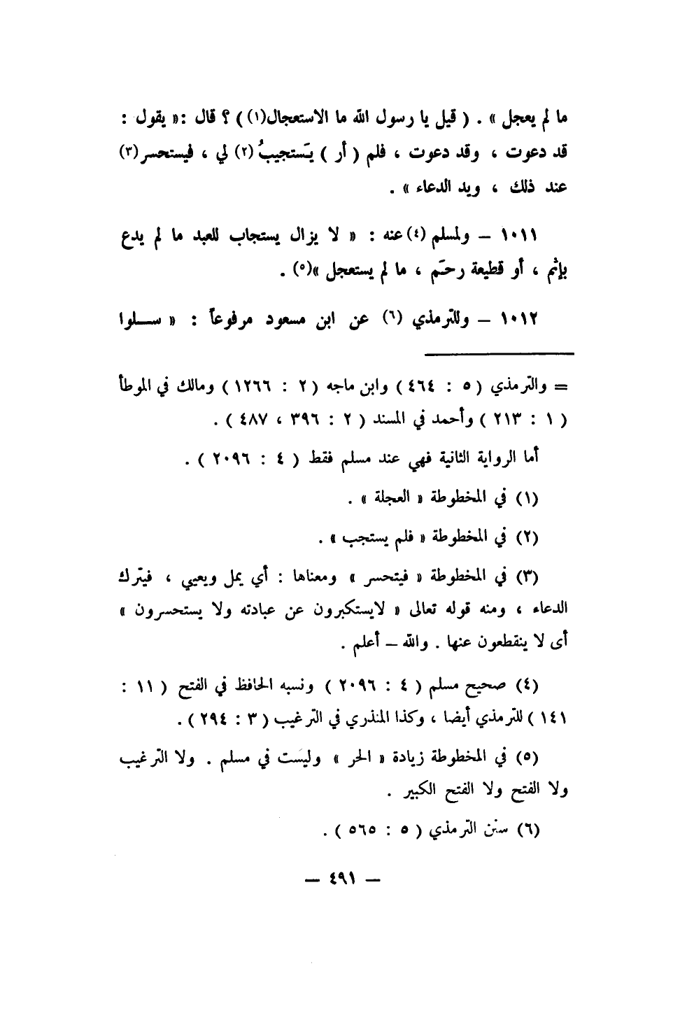 3 في المخطوطة: "فيتحسر"، ومعناها: أي يمل ويعيَي, فيترك الدعاء, ومنه قوله تعالى: {لا يستكبرون عن عبادته ولا يستحسرون} أى: لا ينقطعون عنها. والله - أعلم.