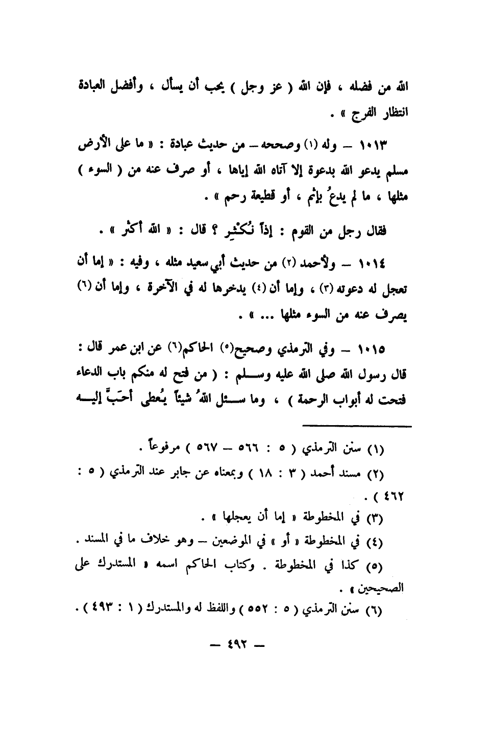 1015- وفي الترمذي وصحيح 6 الحاكم 7 عن ابن عمر قال: قال رسول الله صلى الله عليه وسلم: (من فتح له منكم باب الدعاء فتحت له أبواب الرحمة) ، وما سئل اللهُ شيئاً يُعْطَى أحَبَّ إليه