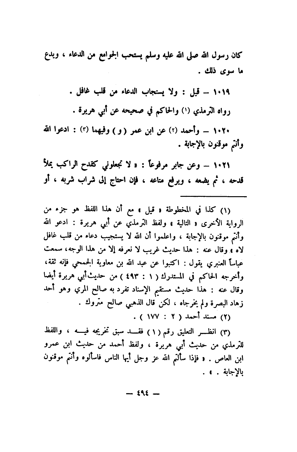 3 انظر التعليق رقم (1) فقد سبق تخريجه فيه, واللفظ للترمذي من حديث أبي هريرة, ولفظ أحمد من حديث ابن عمرو بن العاص: "فإذا سألتم الله عز وجل أيها الناس فاسألوه وأنتم موقنون بالإجابة".