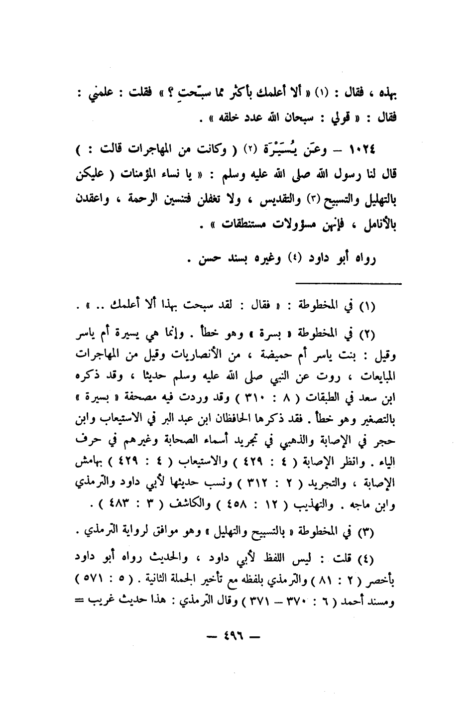 1024- وعن يُسيرة 2 (وكانت من المهاجرات قالت:) قال لنا رسول الله صلى الله عليه وسلم: (يا نساء المؤمنات (عليكن بالتهليل والتسبيح 3 والتقديس، ولا تغفلن فتنسين الرحمة، واعقدن بالأنامل، فإنهن مسؤولات مستنطقات (رواه أبو داود 4 وغيره بسند حسن.