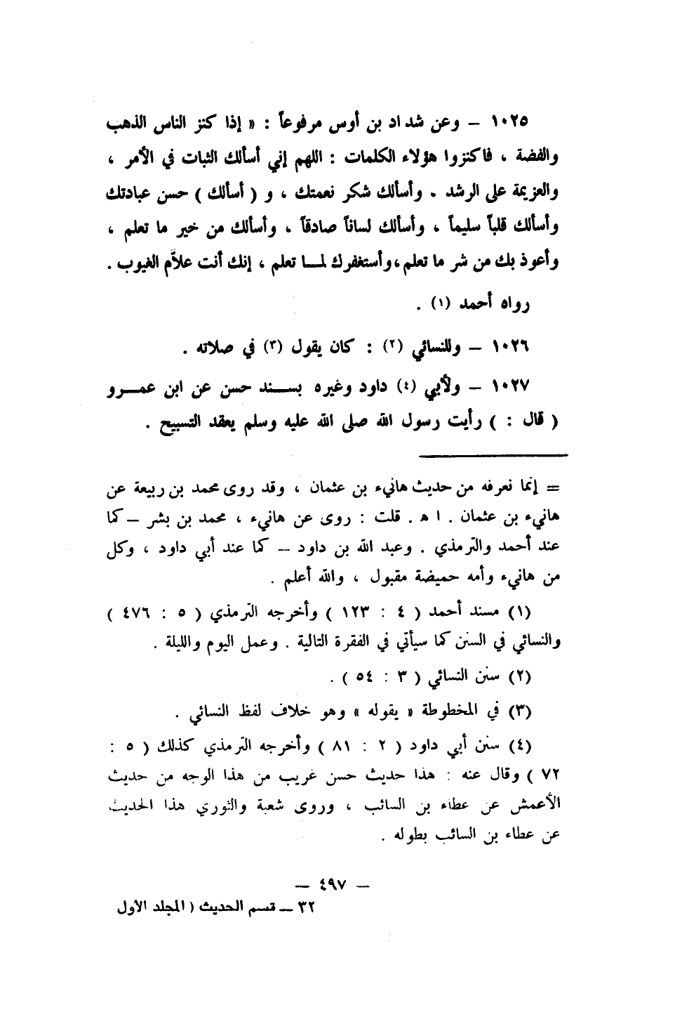 1025- وعن شداد بن أوس مرفوعاً: (إذا كنْز الناس الذهب والفضة، فاكنزوا هؤلاء الكلمات: اللهم إني أسألك الثبات في الأمر، والعزيمة على الرشد، وأسألك شكر نعمتك، و (أسألك) حسن عبادتك وأسألك قلباً سليماً، وأسألك لساناً صادقاً، وأسألك من خير ما تعلم، وأعوذ بك من شر ما تعلم، وأستغفرك لما تعلم، إنك أنت علاّم الغيوب) .