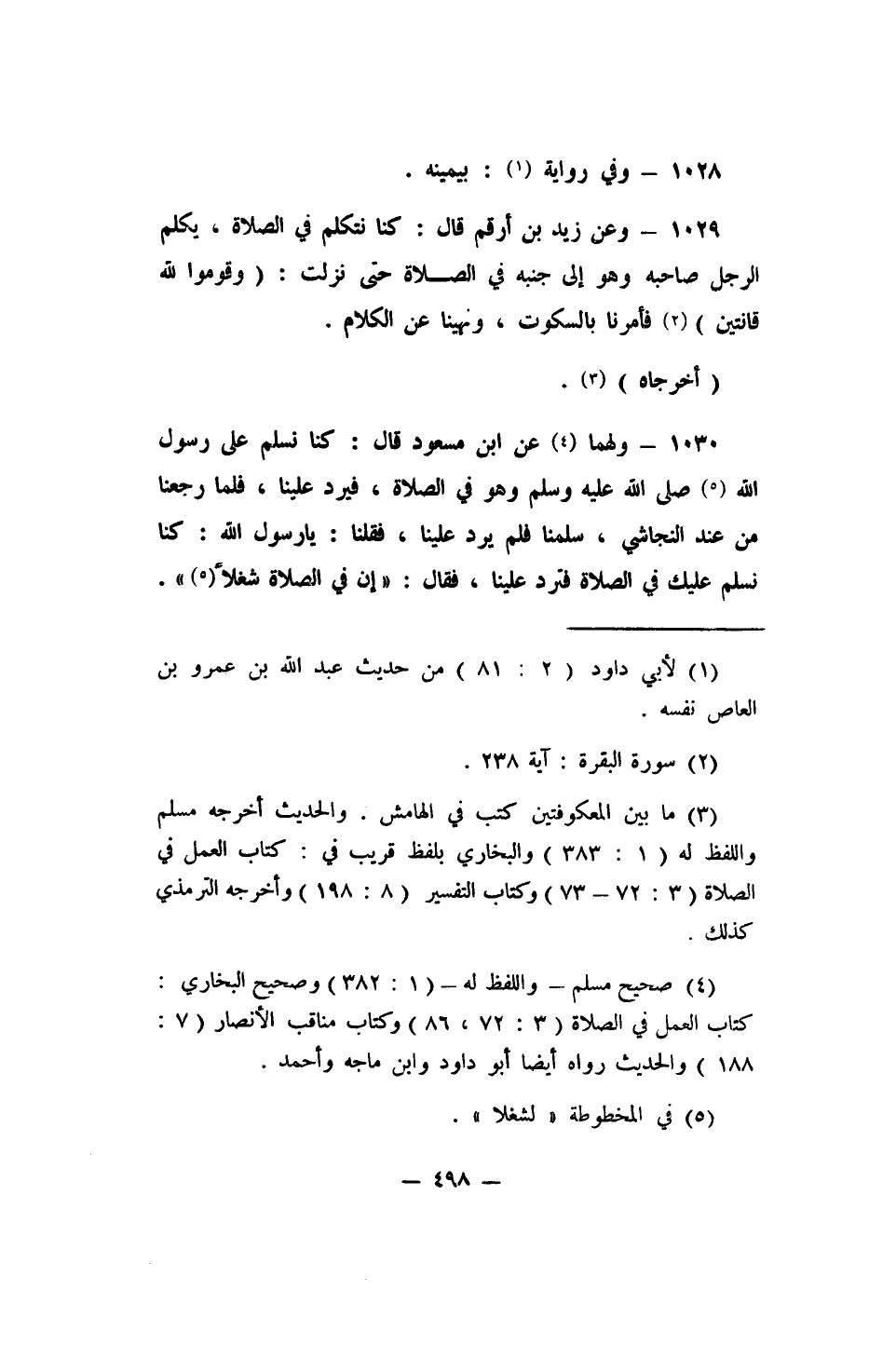 1029- وعن زيد بن أرقم قال: (كنا نتكلم في الصلاة، يكلم الرجل صاحبه وهو إلى جنبه في الصلاة حتى نزلت: {وَقُومُوا لِلَّهِ قَانِتِينَ} 2 فأمرنا بالسكوت، ونهينا عن الكلام) .