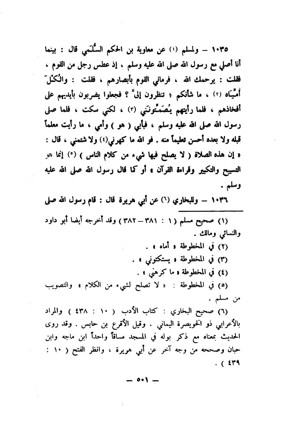 1035- ولمسلم 1 عن معاوية بن الحكم السُّلَمي قال: بينما أنا أصلي مع رسول الله صلى الله عليه وسلم إذ عطس رجل من القوم، فقلت: يرحمك الله، فرماني القوم بأبصارهم، فقلت: وَاثُكْلَ أُمِّيَاه، 2 ما شأنكم; تنظرون إليَّ؟ فجعلوا يضربون بأيديهم على أفخاذهم، فلما رأيتهم يُصَمِتُّونَنِي، 3 لكني سكت، فلما صلى رسول الله صلى الله عليه وسلم فبأبي (هو) وأمي، ما رأيت معلماً قبله ولا بعده أحسن تعليماً منه. فوالله ما كهرني 4 ولا شتمني، قال: (إن هذه الصلاة (لا يصلح فيها شيء من كلام الناس) 5 إنما هو التسبيح والتكبير وقراءة القرآن) أو كما قال رسول الله صلى الله عليه وسلم.