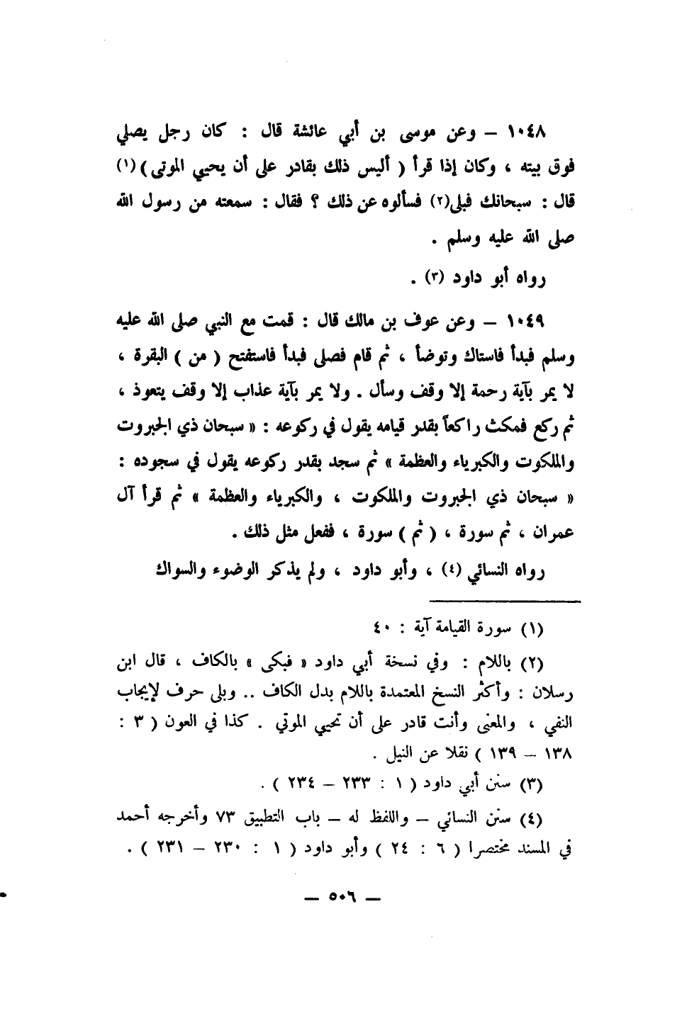 1048- وعن موسى بن أبي عائشة قال: (كان رجل يصلي فوق بيته، وكان إذا قرأ {أليس ذلك بقادر على أن يحيي الموتى} 1 قال: سبحانك فبلى 2. فسألوه عن ذلك؟ فقال: سمعته من رسول الله صلى الله عليه وسلم) .