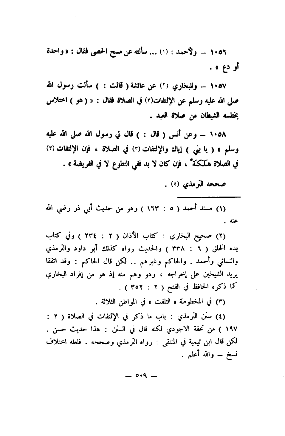 1058- وعن أنس (قال:) قال لي رسول الله صلى الله عليه وسلم (يا بني) إياك والإلتفات 4 في الصلاة، فإن الإلتفات 5 في الصلاة هلكة، فإن كان لابد ففي التطوع لا في الفريضة) .