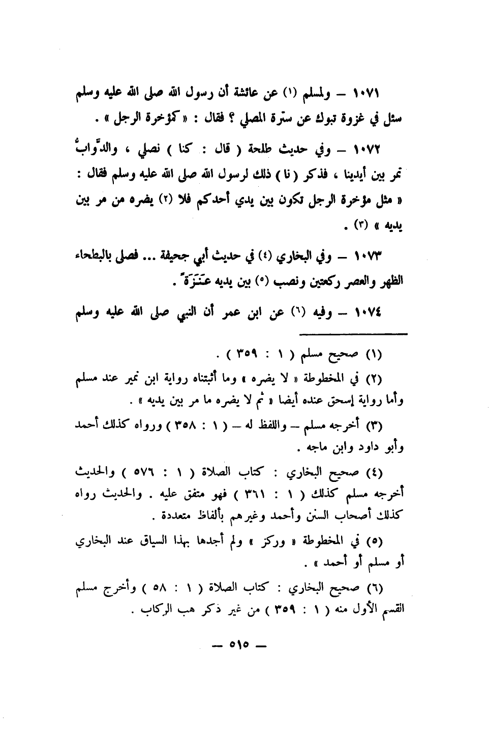 1072- وفي حديث طلحة (قال: كنا) نصلي، والدَّوابُّ تمر بين أيدينا، فذكر (نا) ذلك لرسول الله صلى الله عليه وسلم فقال: (مثل مؤخره الرحل تكون بين يدي أحدكم، فلا 2 يضره من مر بين يديه) 3.