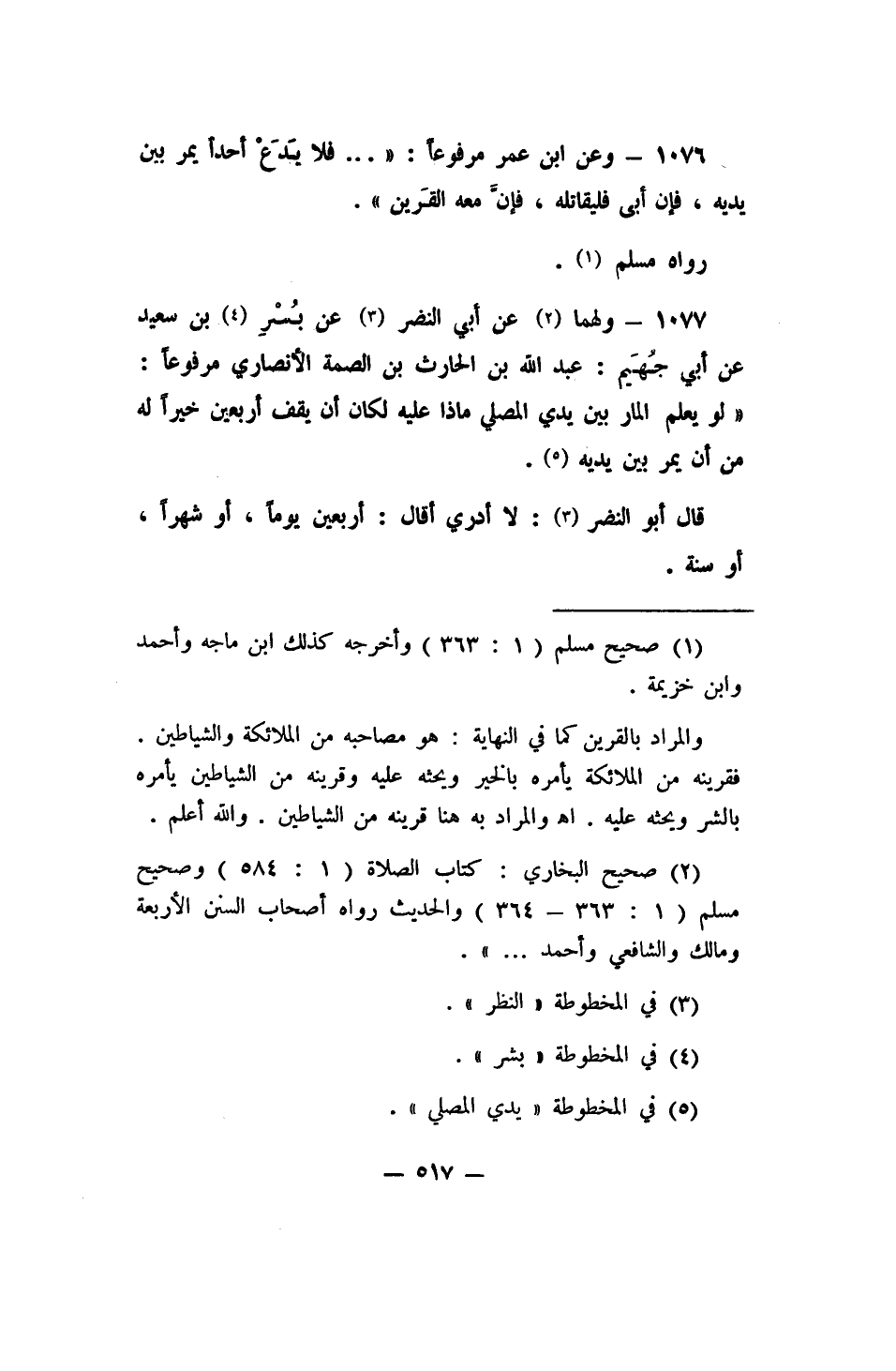 1077- ولهما 2 عن أبي النضر 3 عن بُسْر 4 بن سعيد عن أبي جُهَيم: عبد الله بن الحارث بن الصمة الأنصاري مرفوعاً: (لو يعلم المار بين يدي المصلي ماذا عليه لكان أن يقف أربعين خيراً له من أن يمر بين يديه) 5 قال أبو النضر: (لا أدري أقال: أربعين يوما، أو شهرا، أو سنة) .