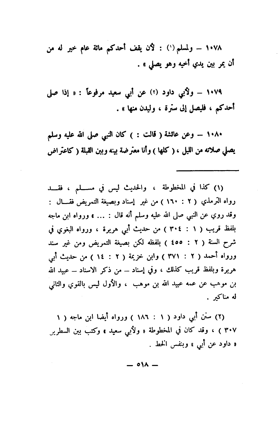1078- ولمسلم 1: (لأن يقف أحدكم مائة عام خير له من أن يمر بين يدي أخيه وهو يصلي) .