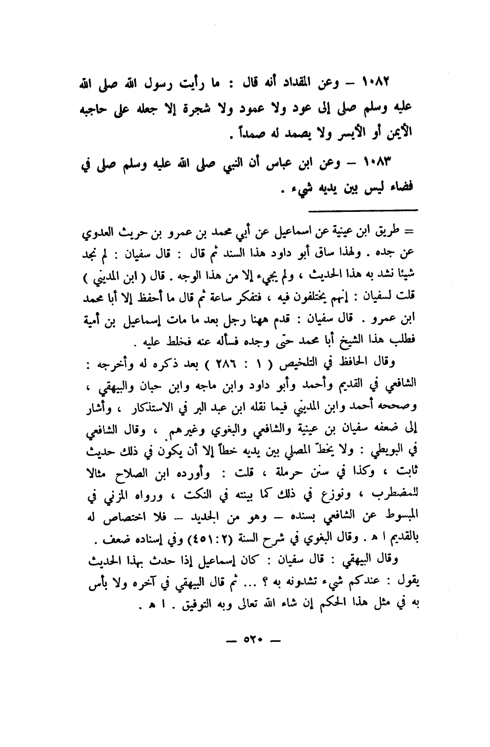 1082- وعن المقداد أنه قال: (ما رأيت رسول الله صلى الله عليه وسلم صلى إلى عود ولا عمود ولا شجرة إلا جعله على حاجبه الأيمن أو الأيسر، ولا يصمد له صمداً) .