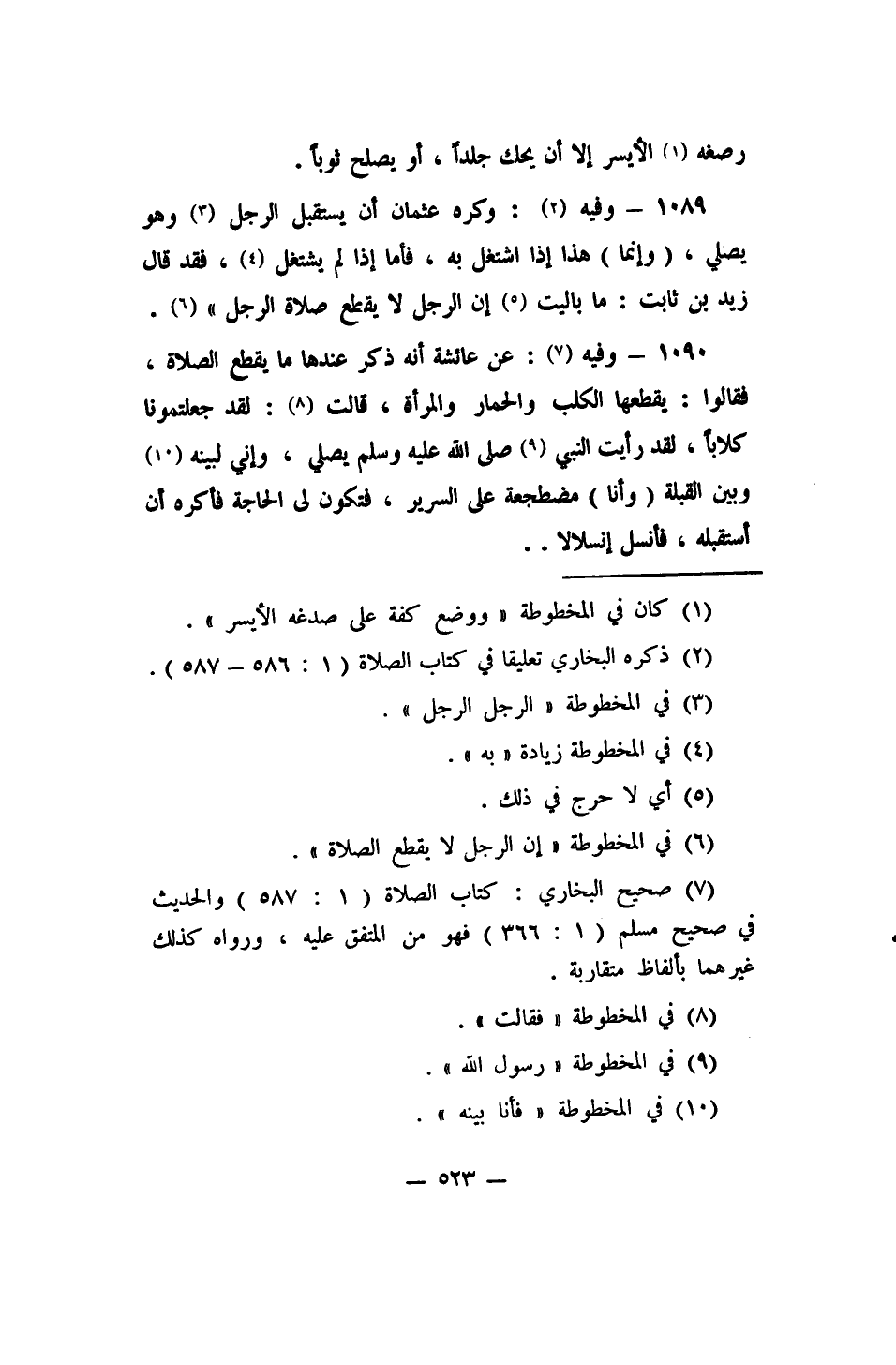 1089- وفيه 2 وكره عثمان أن يستقبل الرجل 3 وهو يصلي، (وإنما) هذا إذا اشتغل به، فأما إذا لم يشتغل 4 فقد قال زيد بن ثابت (ماباليت، 5 إن الرجل لا يقطع صلاة الرجل) 6.