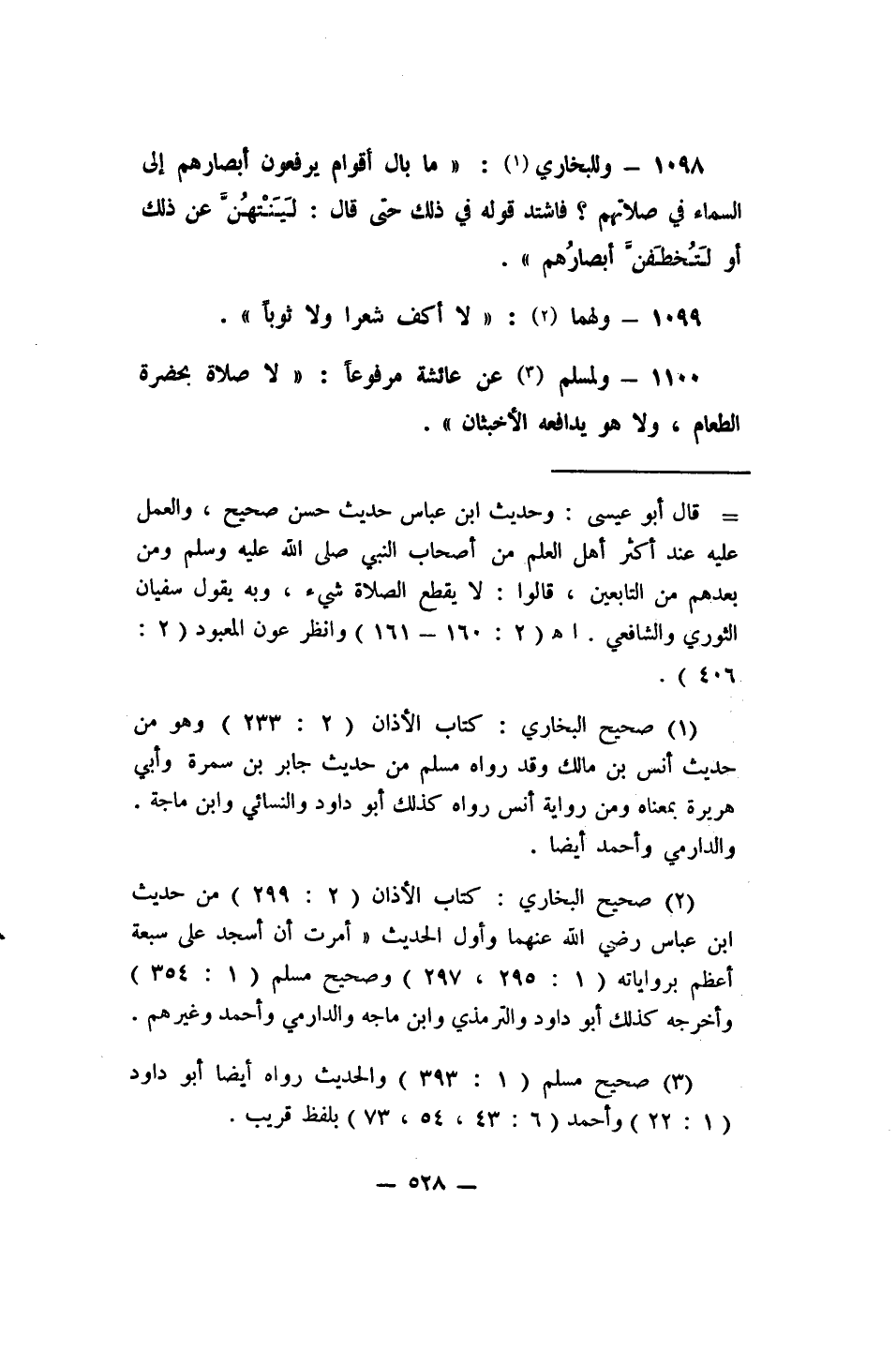 1098- وللبخاري 1: (ما بال أقوام يرفعون أبصارهم إلى السماء في صلاتهم؟ فاشتد قوله في ذلك حتى قال: لَيَنْتَهُنَّ عن ذلك أو لَتُخْطَفَنَّ أبصارُهم) .