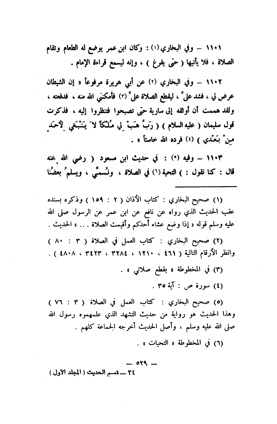 1102- وفي البخاري 2 عن أبي هريرة مرفوعاً (إن الشيطان عرض لي، فشد عليَّ ليقطع الصلاة عليَّ، 3 فأمكنني الله منه فدفعته، ولقد هممت أن أوثقه إلى سارية حتى تصبحوا فتنظروا إليه، فذكرت قول سليمان (عليه السلام) {رَبِّ اغْفِرْ لِي وَهَبْ لِي مُلْكاً لاَّ يَنبَغِي لأَحَدٍ مِّن بَعْدِي} 4 فرده الله خاسئاً) .