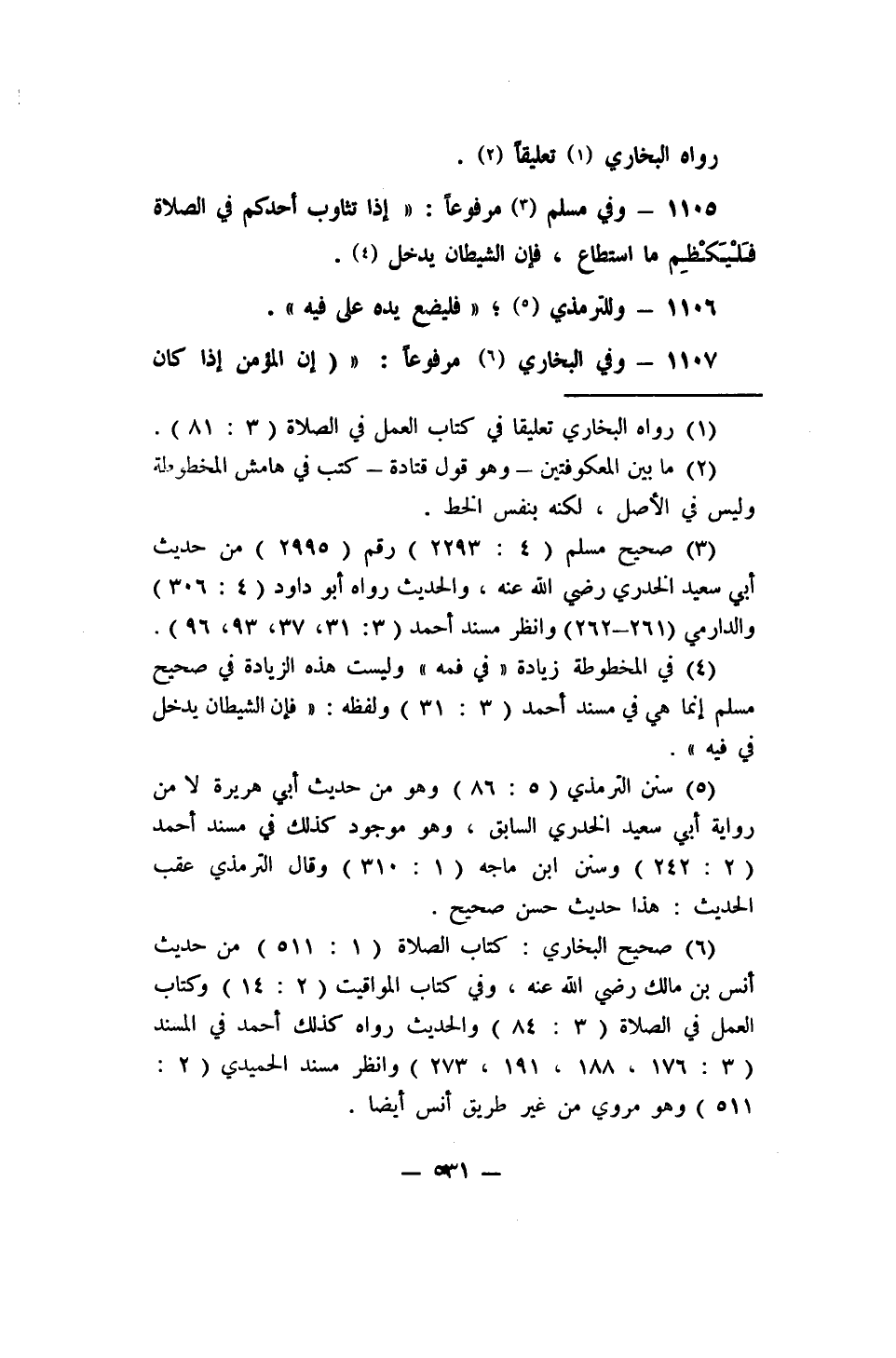 1105- وفي مسلم 3 مرفوعاً: (إذا تثاوب أحدكم في الصلاة فَلْيَكْظِم ما استطاع، فإن الشيطان يدخل) 4.