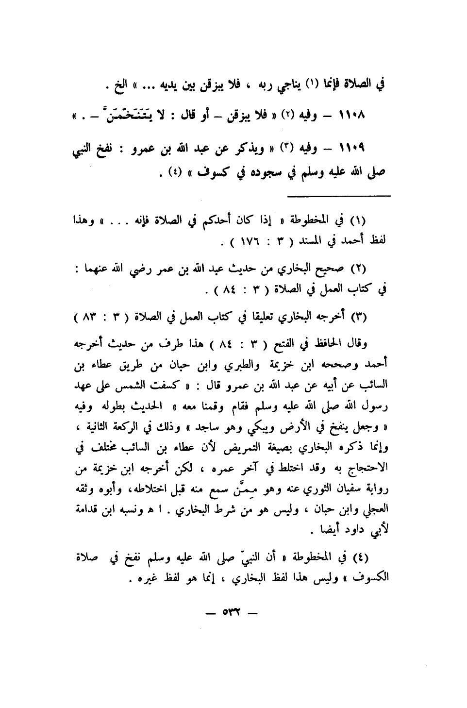 1109- وفيه 3 ويذكر عن عبد الله بن عمرو: (نفخ النبي صلى الله عليه وسلم في سجوده في كسوف) 4.