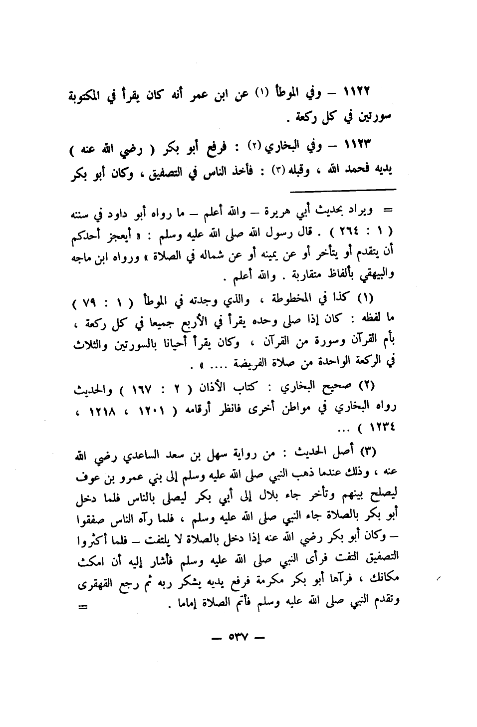 1122- وفي الموطأ 1 عن ابن عمر (أنه كان يقرأ في المكتوبة سورتين في كل ركعة) .