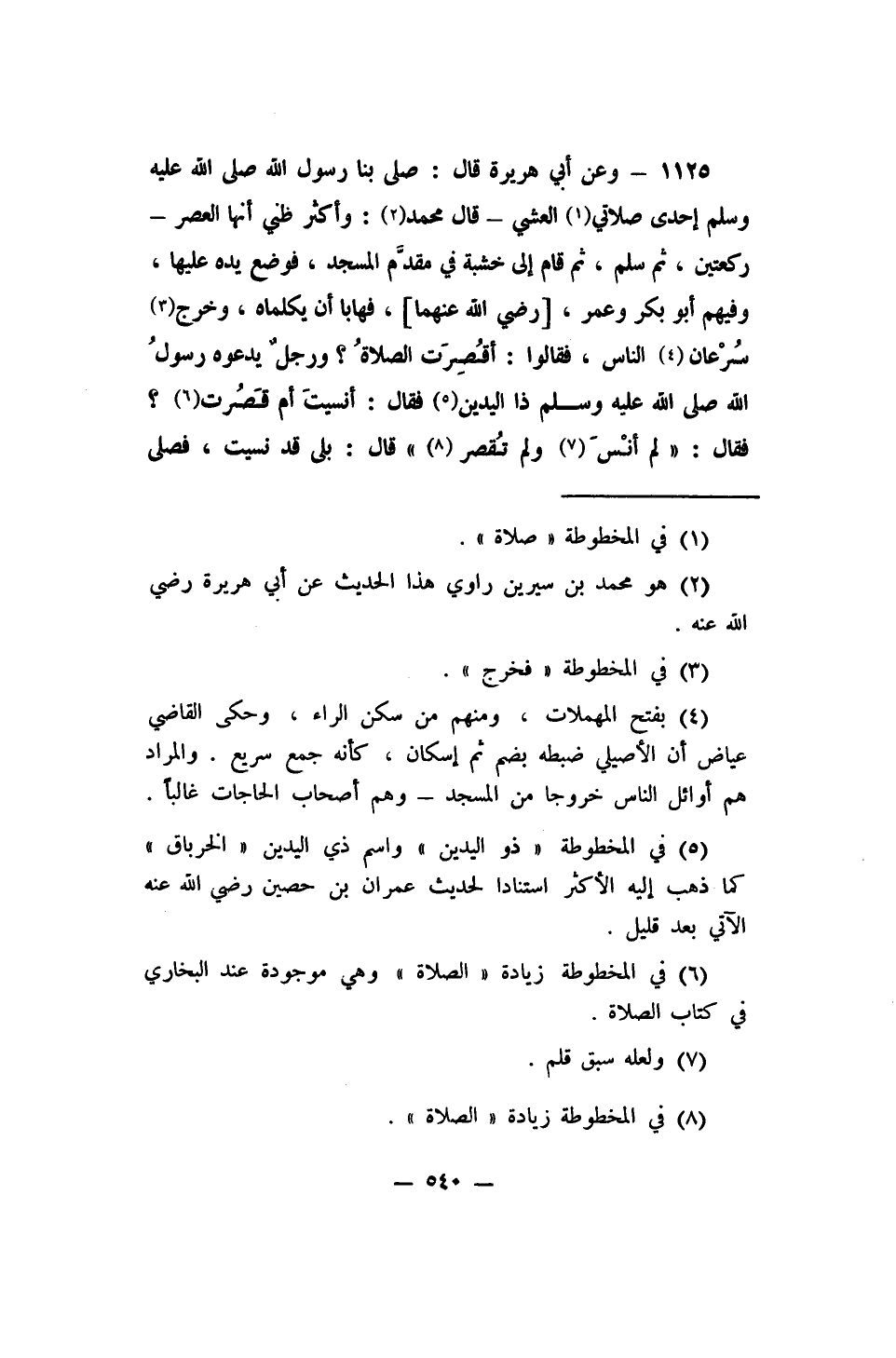 1125- وعن أبي هريرة قال: (صلى بنا رسول الله صلى الله عليه وسلم إحدى صلاتي 1 العشي - قال محمد 2 وأكثر ظني أنها العصر - ركعتين، ثم سلم، ثم قام إلى خشبة في مقدَّم المسجد، فوضع يده عليها، وفيهم أبو بكر وعمر، [رضي الله عنهما] ، فهابا أن يكلماه، وخرج 3 سُرْعان 4 الناس، فقالوا: أقُصِرَت الصلاةُ؟ ورجلٌ يدعوه رسولُ الله صلى الله عليه وسلم ذا اليدين 5 فقال: أنسيتَ أم قَصُرت 6؟ فقال: لم أنْسَ 7 ولم تُقصر 8 قال: بلى قد نسيت، فصلى