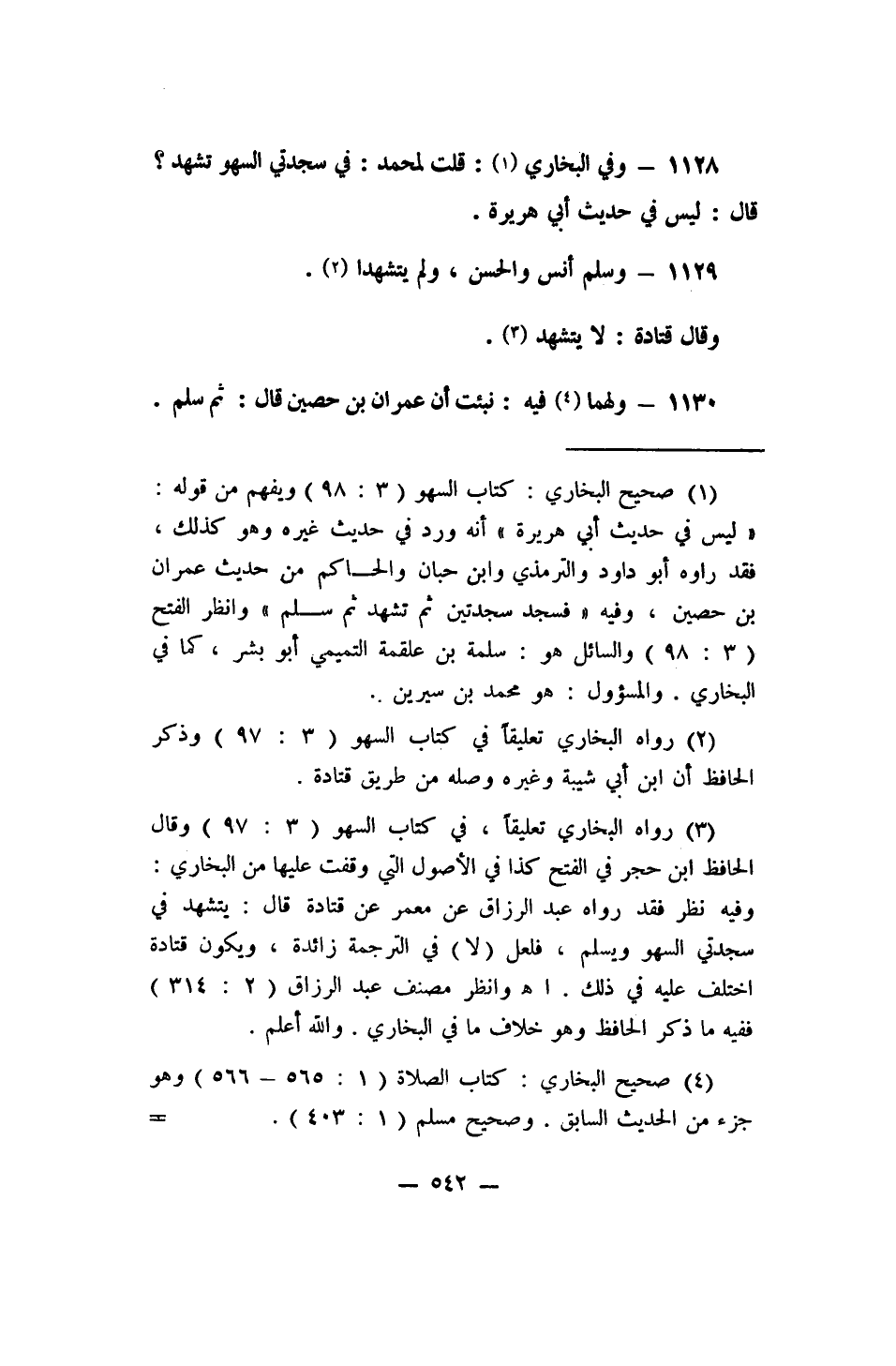 1128- وفي البخاري 1 (قلت لمحمد: في سجدتي السهو تشهد؟ قال: ليس في حديث أبي هريرة) .