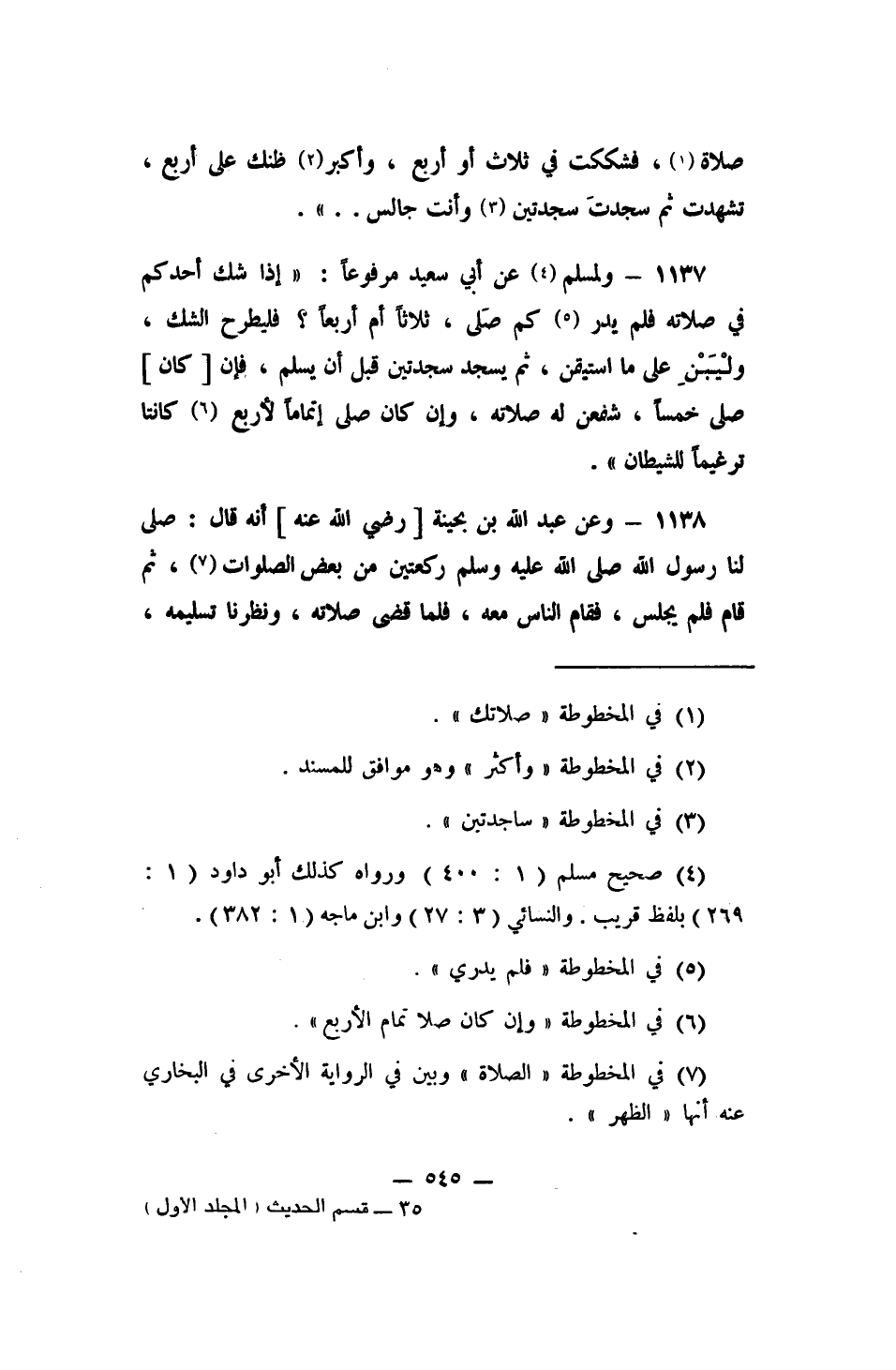 صلاة 1 فشككت في ثلاث أو أربع، وأكبر 2 ظنك على أربع، تشهدت ثم سجدتَ سجدتين 3 وأنت جالس..) .