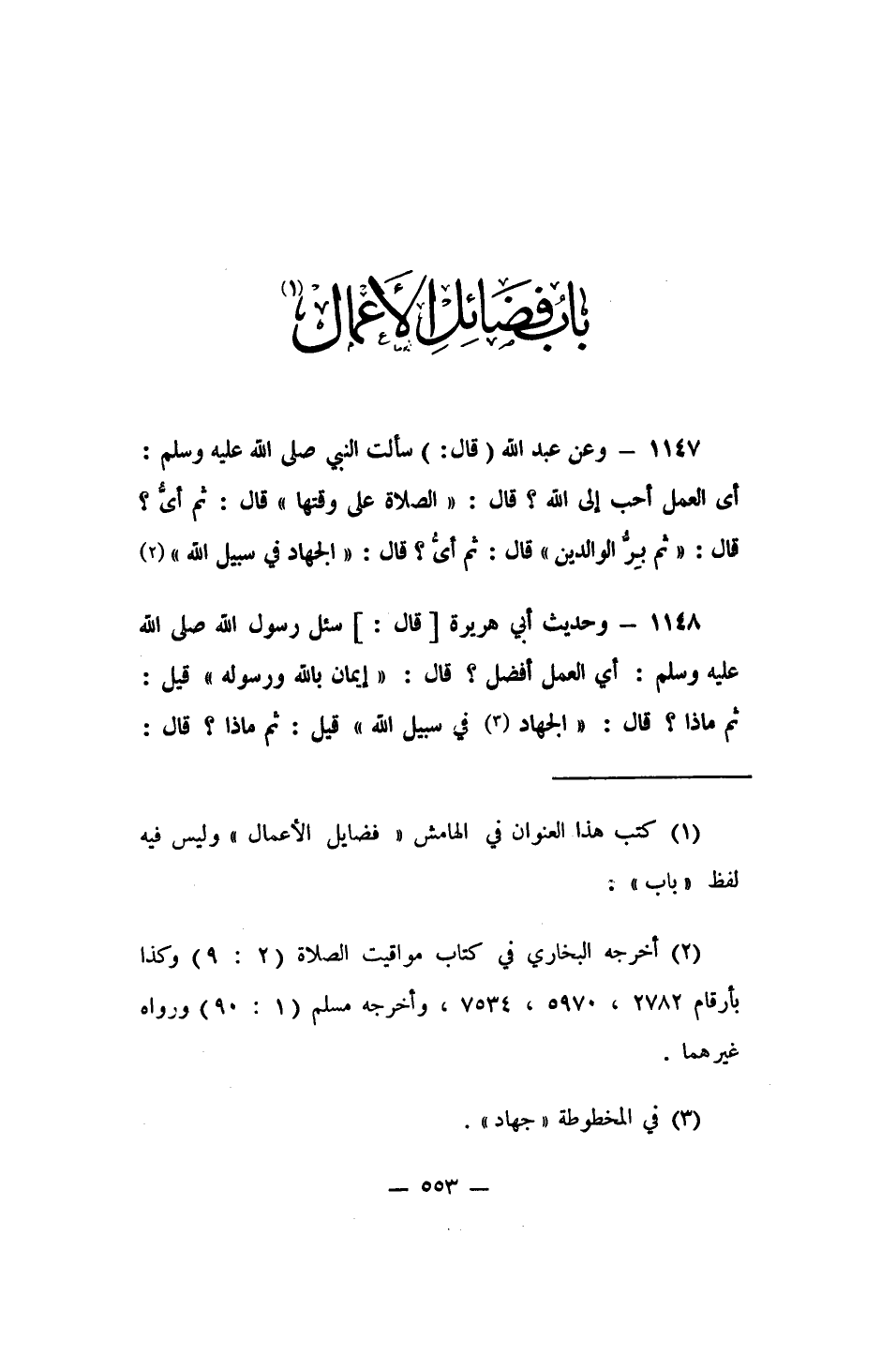 1147- وعن عبد الله (قال:) (سألت النبي صلى الله عليه وسلم أي العمل أحب إلى الله؟ قال: الصلاة على وقتها. قال: ثم أيُّ؟ قال: ثم بِرُّ الوالدين. قال: ثم أيُّ؟ قال: الجهاد في سبيل الله) 2.