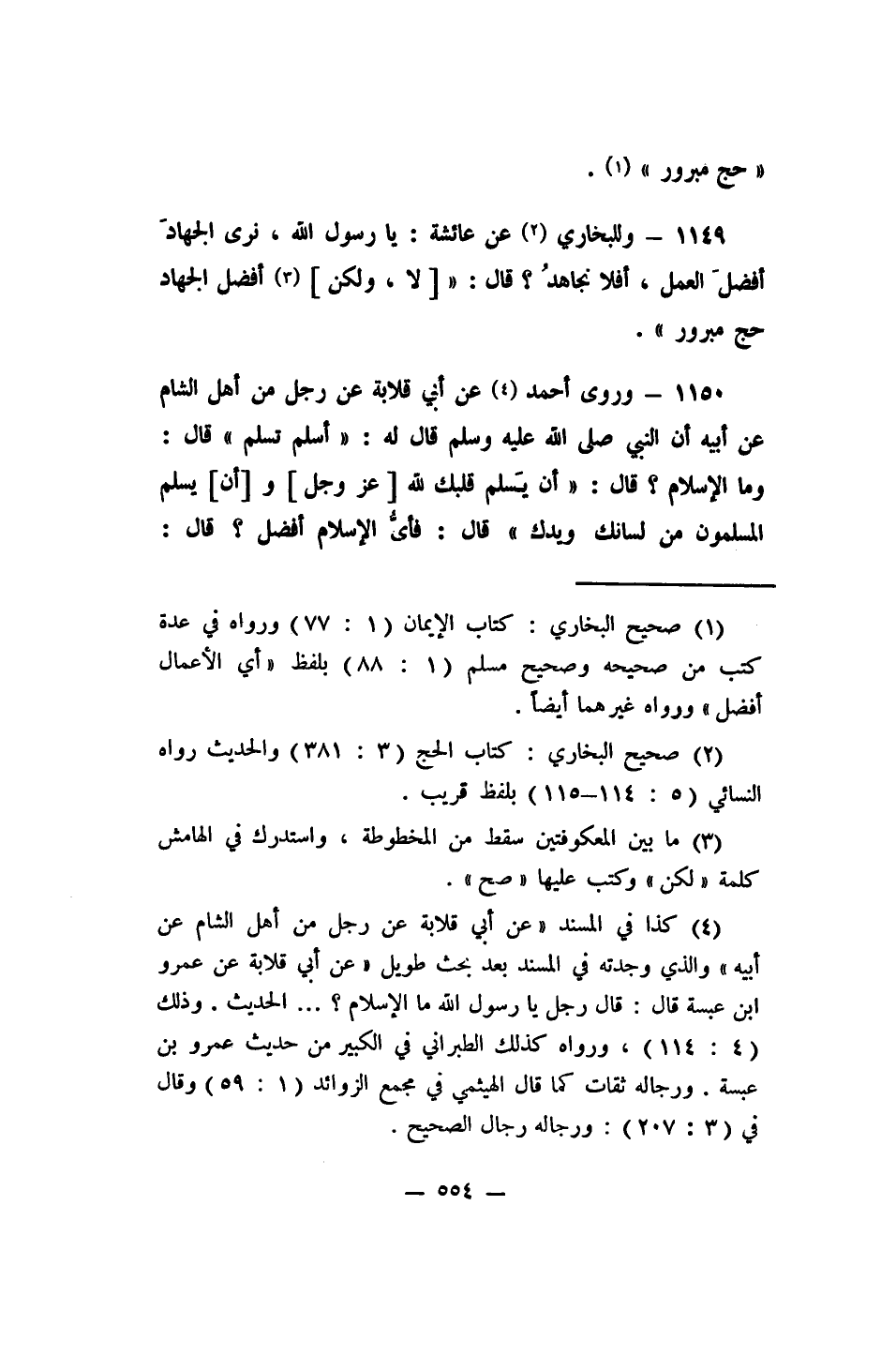 1149- وللبخاري 2 عن عائشة: (يا رسول الله، نرى الجهادَ أفضلَ العمل، أفلا نجاهدُ؟ قال: [لا، ولكن] 3 أفضل الجهاد حج مبرور) .