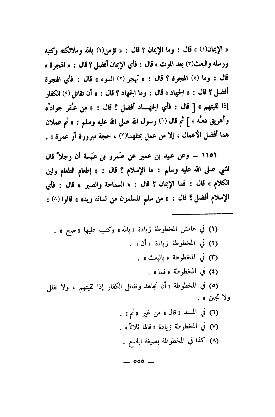 الإيمان 1 قال: وما الإيمان؟ قال: تؤمن 2 بالله وملائكته وكتبه ورسله والبعث 3 بعد الموت. قال: فأي الإيمان أفضل؟ قال: الهجرة قال: وما 4 الهجرة؟ قال: تهجر 5 السوء. قال: فأي الهجرة أفضل؟ قال: الجهاد قال: وما الجهاد؟ قال: أن تقاتل 6 الكفار إذا لقيتهم [قال: فأي الجهاد. أفضل؟ قال: من عُقِرَ جَوَادُه وأهريق دمُه] . ثم قال 7 رسول الله صلى الله عليه وسلم: ثم عملان هما أفضل الأعمال، إلا من عمل بمثلهما 8 حجة مبرورة أو عمرة) .