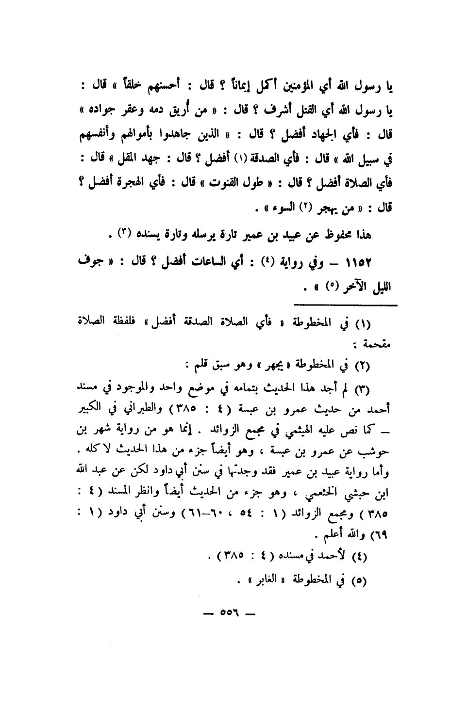 يا رسول الله أي المؤمنين أكمل إيماناً؟ قال: أحسنهم خلقاً. قال: يا رسول الله أي القتل أشرف؟ قال: من أُرِيقَ دَمُهُ وعُقِرَ جوادهُ. قال: فأي الجهاد أفضل؟ قال: الذين جاهدوا بأموالهم وأنفسهم في سبيل الله. قال: فأي الصدقة 1 أفضل؟ قال: جهد المقل. قال: فأي الصلاة أفضل؟ قال: طول القنوت قال: فأي الهجرة أفضل؟ قال: من يهجر 2 السوء) .