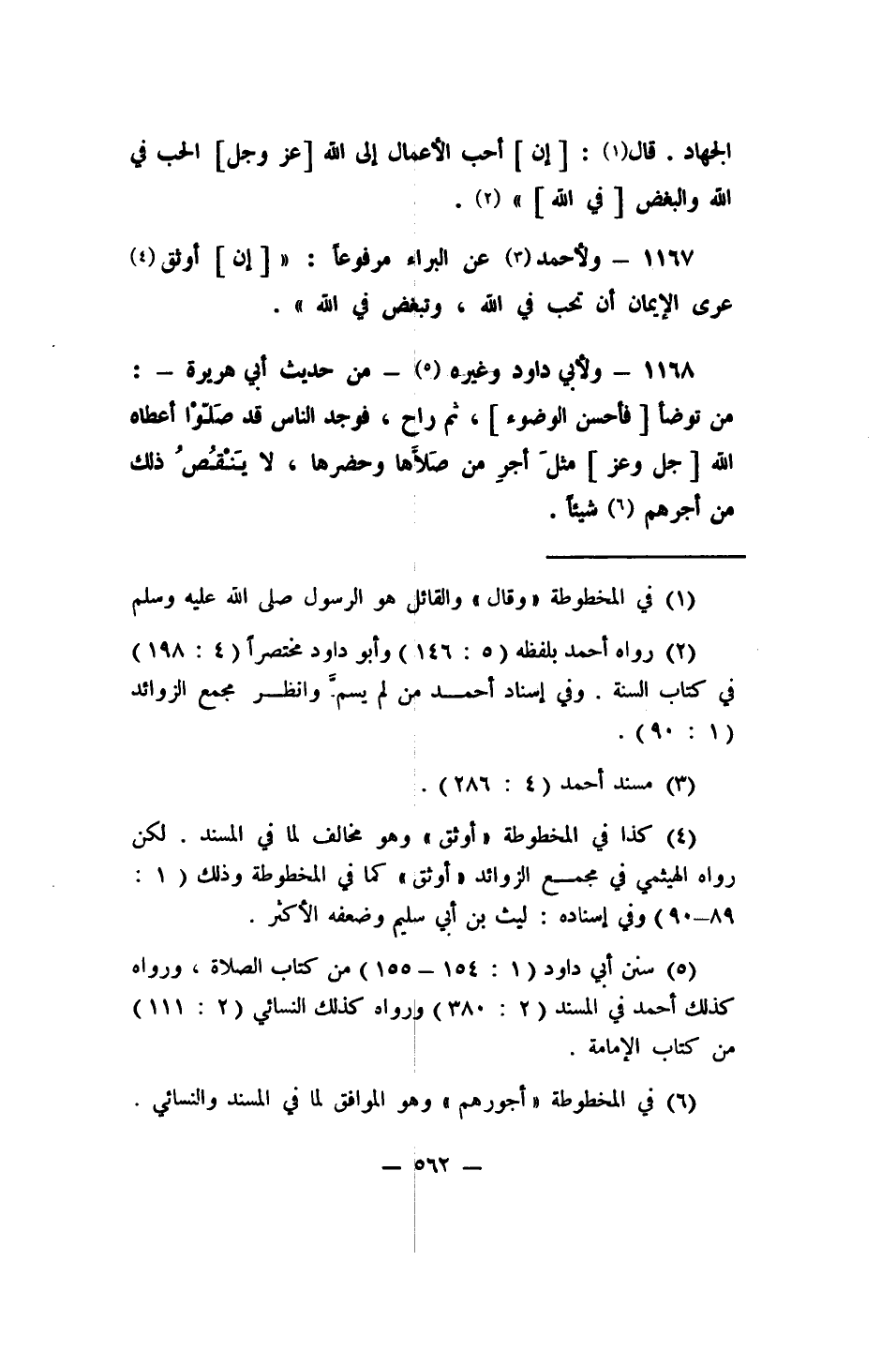 1167- ولأحمد 3 عن البراء مرفوعاً: ( [إن] أوثق 4 عرى الإيمان أن تحب في الله، وتبغض في الله) .