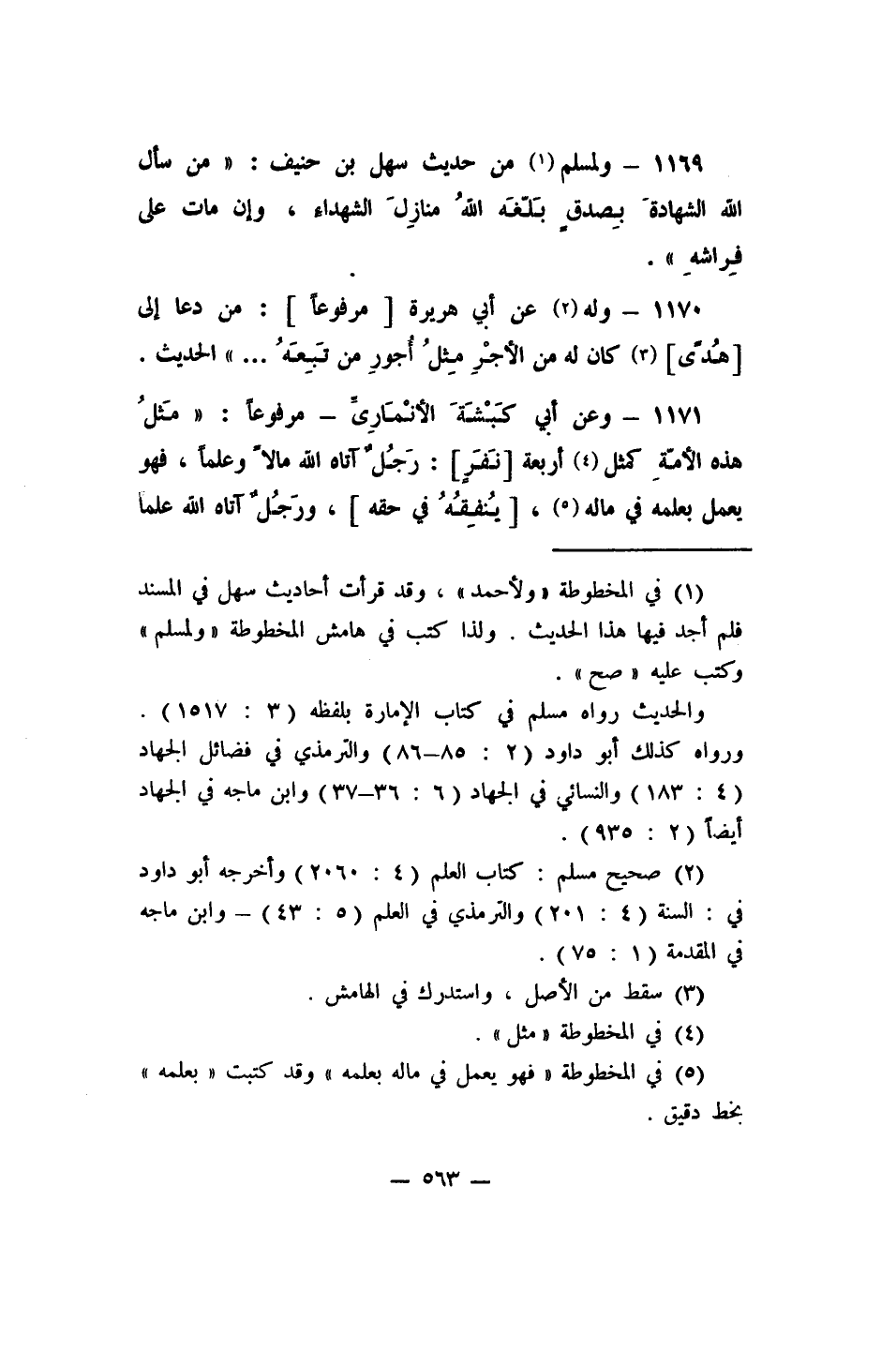 1169- ولمسلم 1 من حديث سهل بن حنيف: (من سأل الله الشهادةَ بِصِدْقٍ بَلَّغَهُ اللهُ مَنَازل الشهداءِ، وإن مات على فِراشه) .