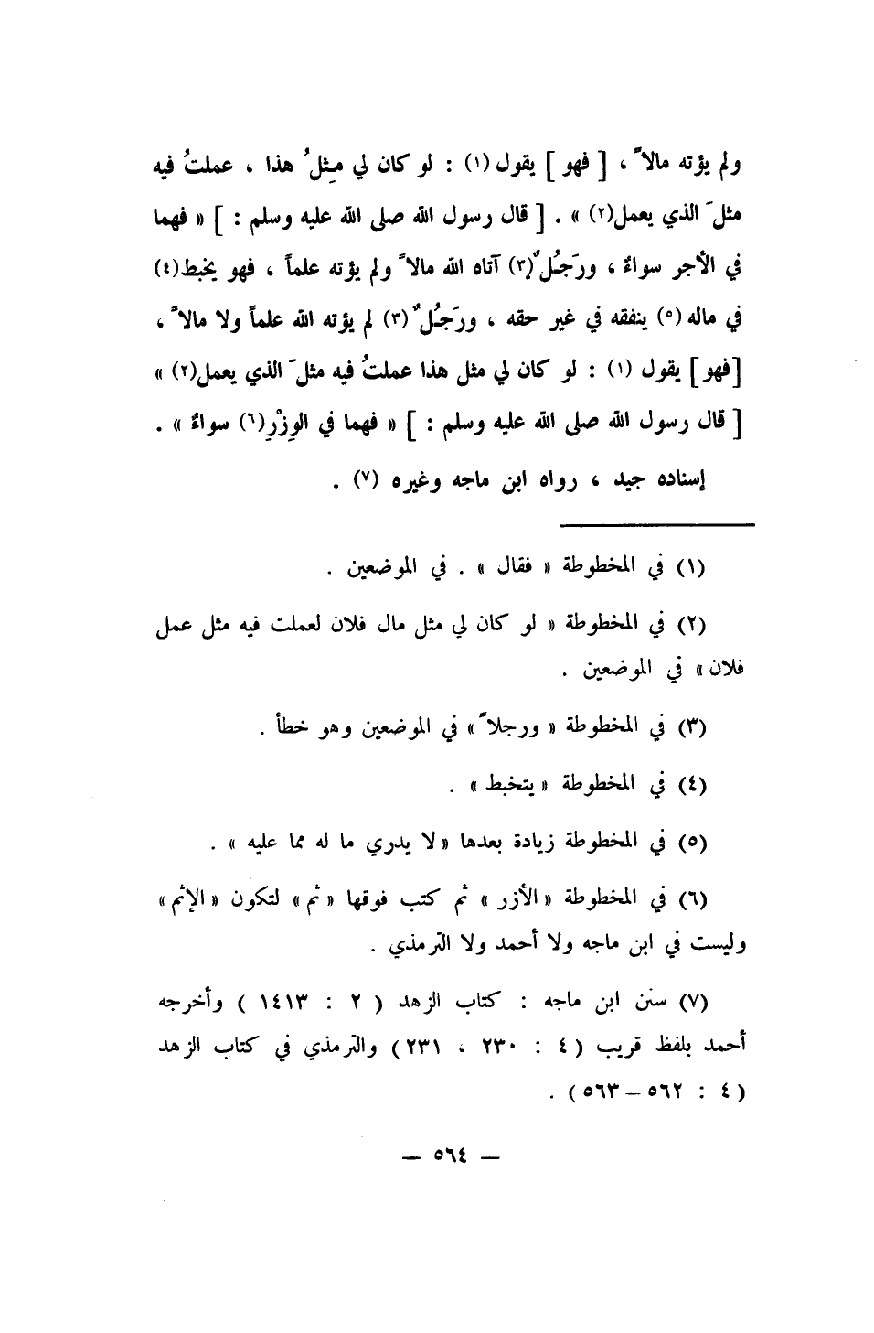ولم يؤته مالاً [فهو] يقول 1 لو كان لي مثلُ هذا، عملتُ فيه مثلَ الذي يعمل 2. [قال رسول الله صلى الله عليه وسلم] : فهما في الأجر سواءٌ، ورجُلٌ 3 آتاه الله مالاً ولم يؤته علماً، فهو يخبط 4 في ماله 5 ينفقه في غير حقه، ورَجُلٌ لم يؤته الله علماً ولا مالاً، [فهو] يقو ل6: لو كان لي مثل هذا عملتُ فيه مثلَ الذي يعمل. [قال رسول الله صلى الله عليه وسلم] : فهما في الوِزْرِ 7 سواءٌ) .