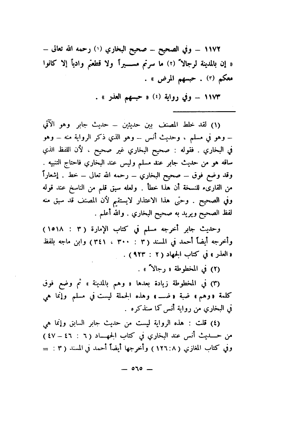 1172- وفي الصحيح - صحيح البخاري 1 رحمه الله تعالى: (إن بالمدينة لرجالاً 2 ما سرتم مسيراً ولا قطعتم وادياً إلا كانوا معكم 3. حبسهم المرض) .