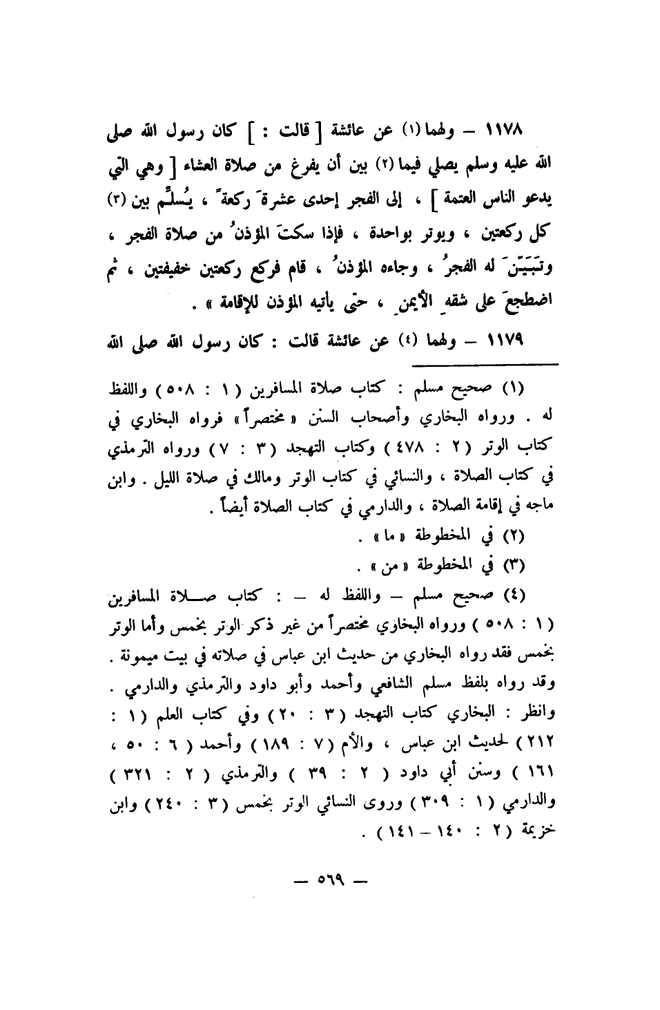 1178- ولهما 1 عن عائشة [قالت:] (كان رسول الله صلى الله عليه وسلم يصلي فيما 2 بين أن يفرغ من صلاة العشاء [وهي التي يدعو الناس العتمة] ، إلى الفجر إحدى عشرةَ ركعةً، يُسَلِّمُ بين 3 كل ركعتين، ويوتر بواحدة، فإذا سكتَ المؤذنُ من صلاة الفجر، وتَبَيَّنَ له الفجرُ، وجاءه المؤذنُ، قام فركع ركعتين خفيفتين، ثم اضطجعَ على شقهِ الأيمنِ، حتى يأتيه المؤذن للإقامة) .