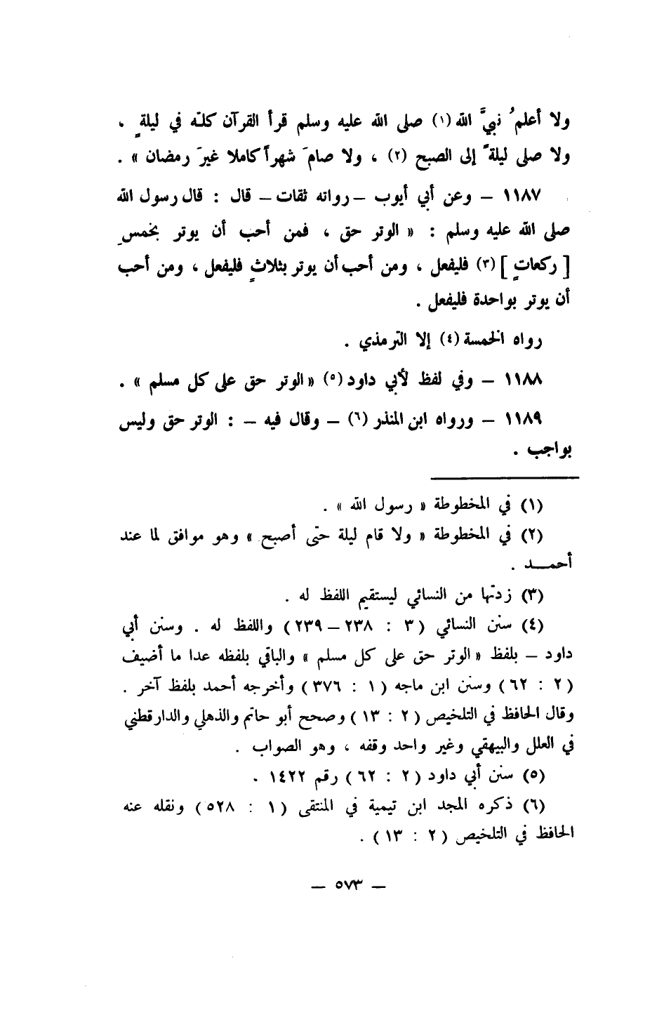 1189- ورواه ابن المنذر 6 - وقال فيه -: الوتر حق وليس بواجب