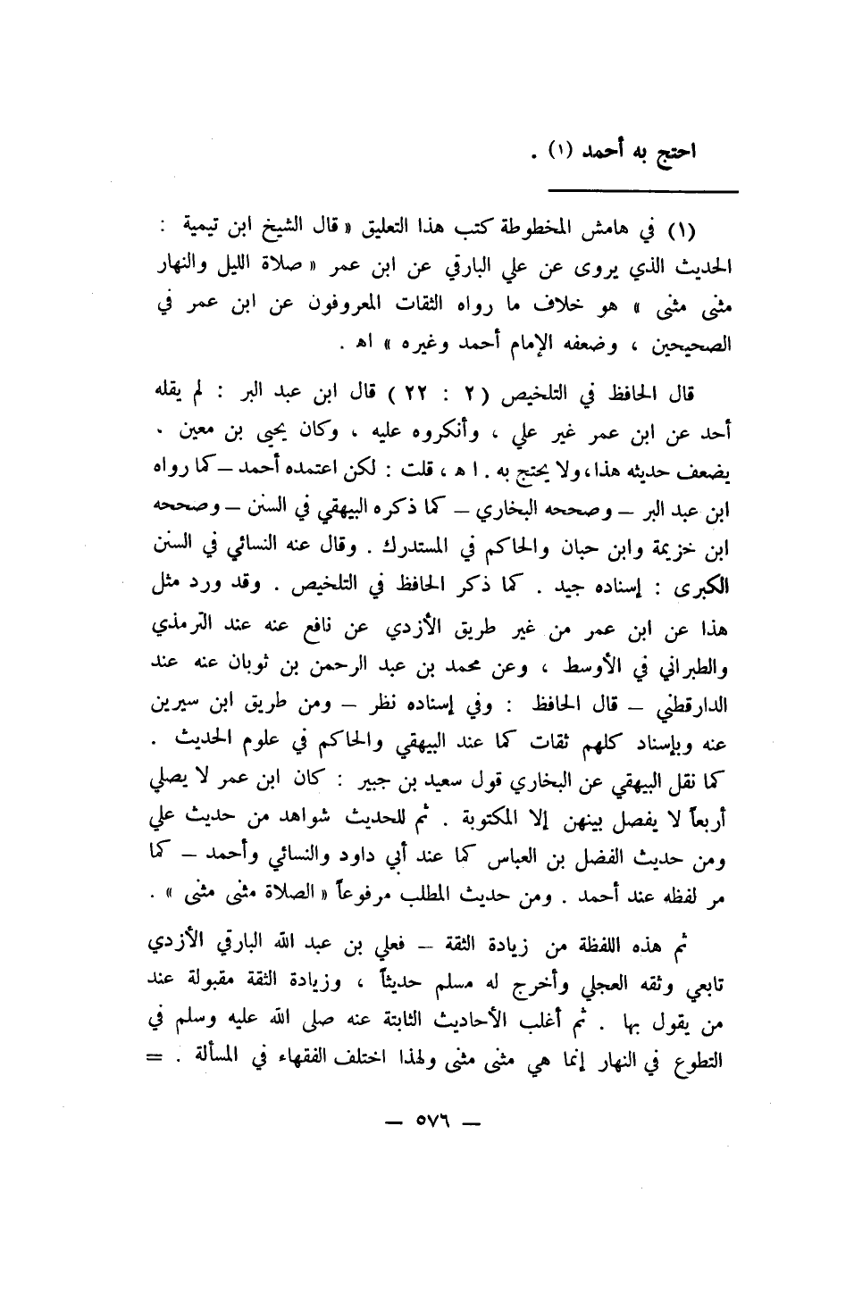 1 في هامش المخطوطة كتب هذا التعليق" "قال الشيخ ابن تيمية: الحديث الذي يروى عن علي البارقي عن ابن عمر" صلاة الليل والنهار مثنى مثنى" هو خلاف ما رواه الثقات المعروفون عن ابن عمر في الصحيحين, وضعفه الإمام أحمد وغيره". اهـ. قال الحافظ في التلخيص (2/ 22) : قال ابن عبد البر: لم يقله أحد عن ابن عمر غير علي, وأنكروه عليه, وكان يحيى بن معين يضعف حديثه هذا, ولا يحتج به. اهـ. قلت: لكن اعتمده أحمد - كما رواه ابن عبد البر - وصححه البخاري - كما ذكره البيهقي في السنن - وصححه ابن خزيمة وابن حبان والحاكم في المستدرك. وقال عنه النسائي في السنن الكبرى: إسناده جيد، كما ذكر الحافظ في التلخيص: وقد ورد مثل هذا عن ابن عمر من غير طريق الأزدي عن نافع عنه عند الترمذي والطبراني في الأوسط, وعن محمد بن عبد الرحمن بن ثوبان عنه عند الدارقطني - قال الحافظ: وفي إسناده نظر - ومن طريق ابن سيرين عنه وبإسناد كلهم ثقات كما عند البيهقي والحاكم في علوم الحديث. كما نقل البيهقي عن البخاري قول سعيد بن جبير: كان ابن عمر لا يصلي أربعا لا يفصل بينهن إلا المكتوبة. ثم للحديث شواهد من حديث علي ومن حديث الفضل بن العباس كما عند أبي داود والنسائي وأحمد - كما مر لفظه عند أحمد ـ ومن حديث المطلب مرفوعا "الصلاة مثنى مثنى"، ثم هذه اللفظة من زيادة الثقة، فعلي بن عبد الله البارقي الأزدي تابعي وثقه العجلي وأخرج له مسلم حديثا, وزيادة الثقة مقبولة عند من يقول بها. ثم أغلب الأحاديث الثابتة عنه صلى الله عليه وسلم في التطوع في النهار إنما هي مثنى مثنى ولهذا اختلف الفقهاء في المسألة. فقال الجمهور من الفقهاء والمحدثين وعلى رأسهم مالك والشافعي وأحمد: إن صلاة الليل والنهار مثنى مثنى، وذهب أبو حنيفة والثوري إلى أن صلاة النهار أربع. وانظر التلخيص (2/22) وسنن الترمذي, والسنن الكبرى للبيهقي في الموضعين المشار إليهما في العزو, والمغني (2/123) وما بعد. والله تعالى أعلم.