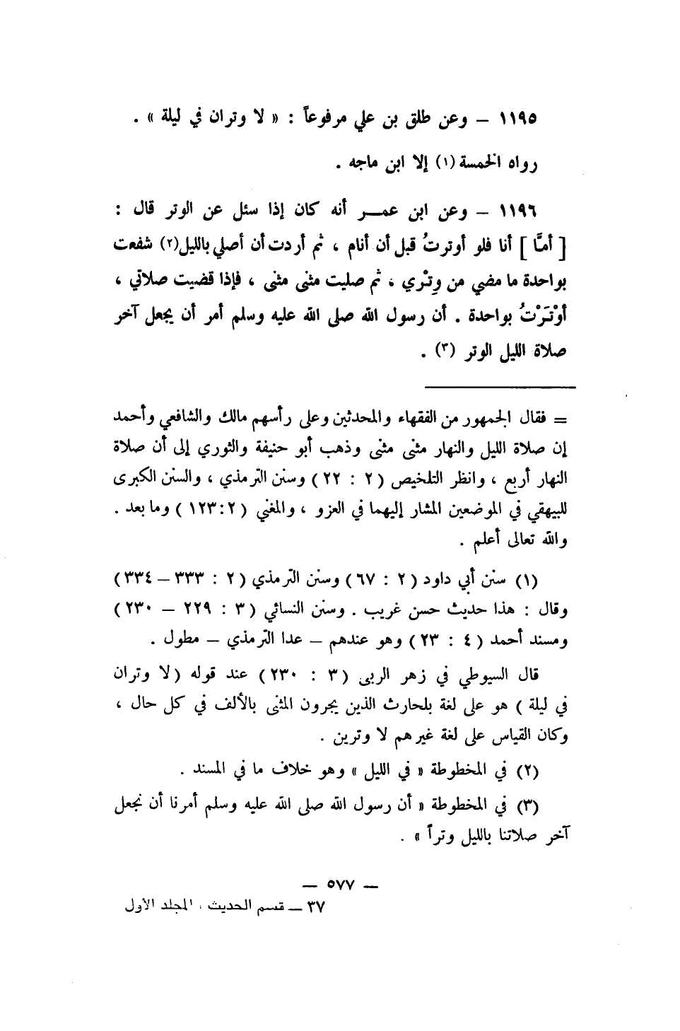 1195- وعن طلق بن علي مرفوعاً: (لا وتران في ليلة) رواه الخمسة 1 إلا ابن ماجة.