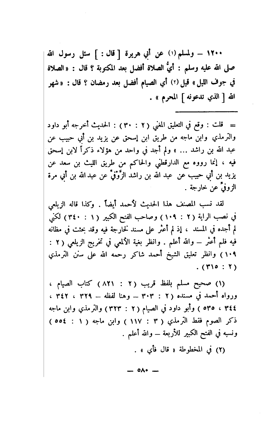 1200- ولمسلم 1 عن أبي هريرة [قال:] (سئل رسول الله صلى الله عليه وسلم: أيُّ الصلاة أفضل بعد المكتوبة؟ قال: الصلاة في جوف الليل، قيل 2: أي الصيام أفضل بعد رمضان؟ قال: شهر الله [الذي تدعونه] المحرم) .