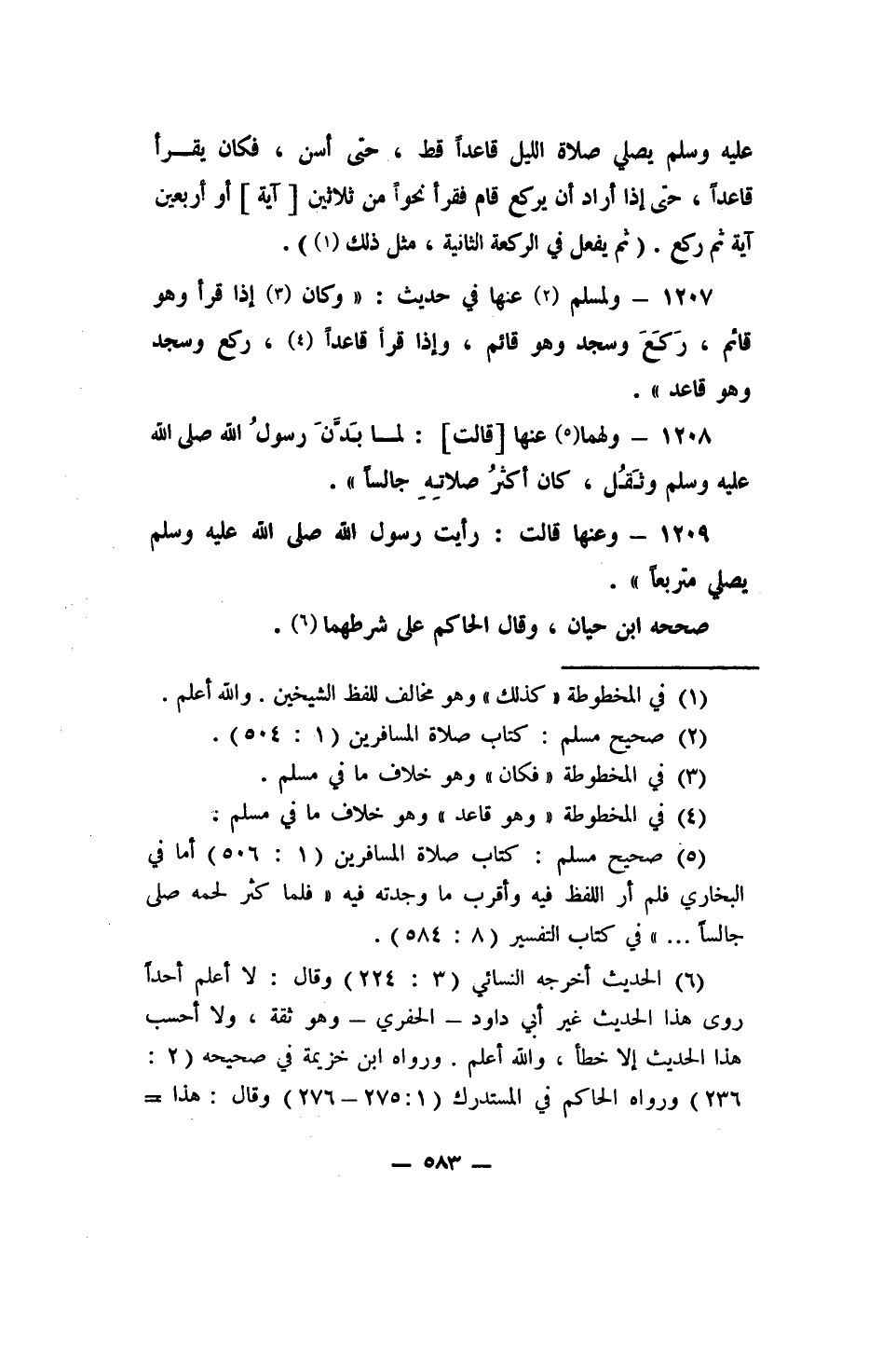 1209- وعنها قالت: (رأيت رسول الله صلى الله عليه وسلم يصلي متربعاً) .