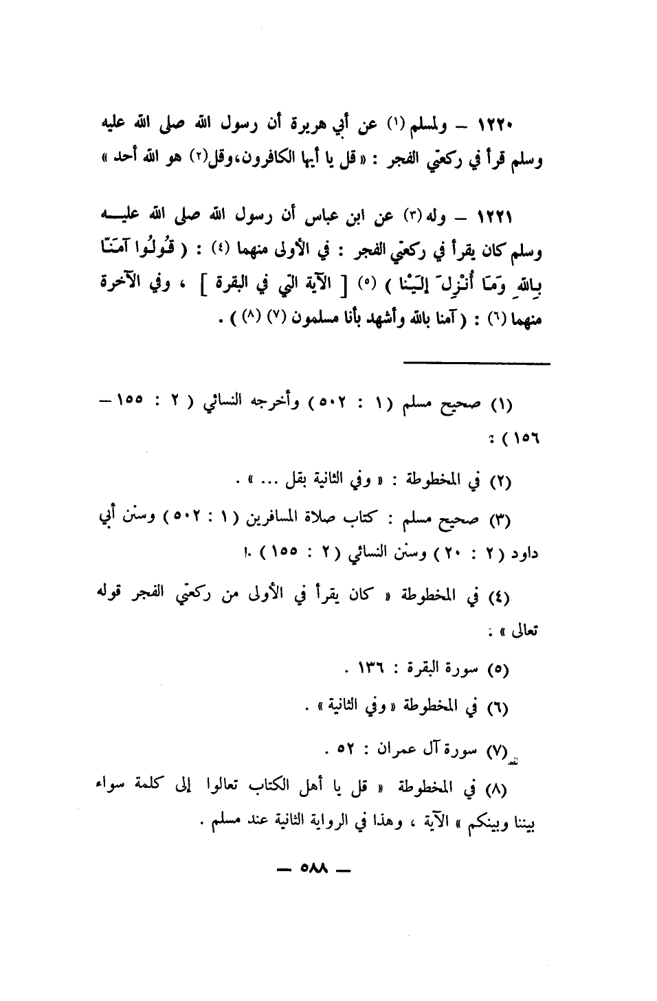1221- وله 3 عن ابن عباس: (أن رسول الله صلى الله عليه وسلم (كان يقرأ في ركعتي الفجر: في الأولى منهما 4: {قُولُوا آمَنَّا بِاللَّهِ وَمَا أُنْزِلَ إِلَيْنَا} 5 [الآية التي في البقرة] وفي الآخرة منهما 6 {وَاشْهَدْ بِأَنَّا مُسْلِمُونَ} 7 (8.