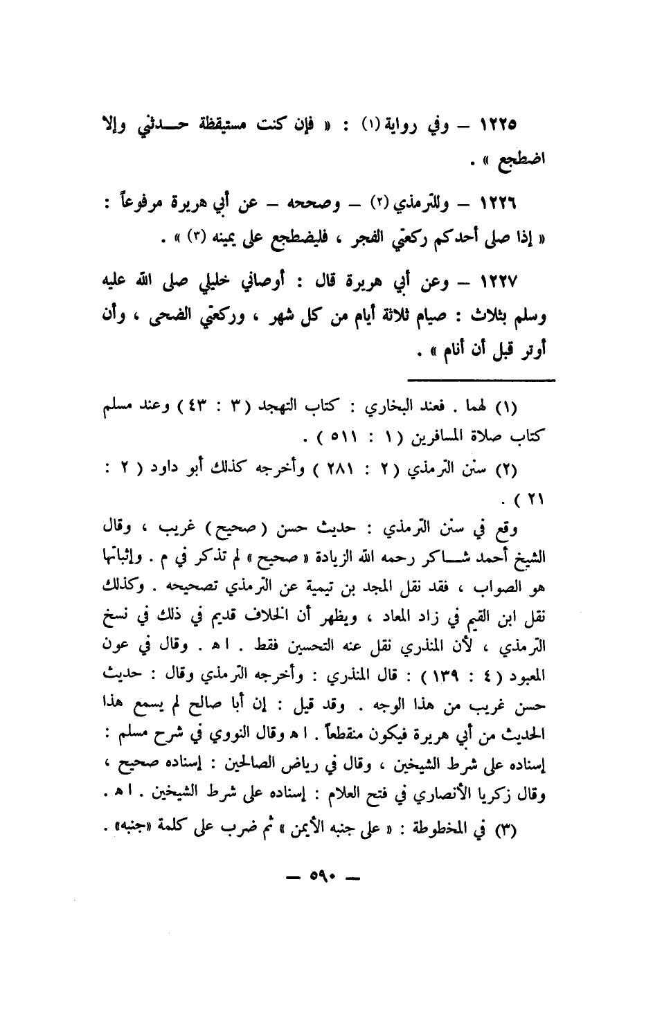 1227- وعن أبي هريرة قال: (أوصاني خليلي صلى الله عليه وسلم بثلاث: صيام ثلاثة أيام من كل شهر، وركعتي الضحى، وأن أوتر قبل أن أنام) .