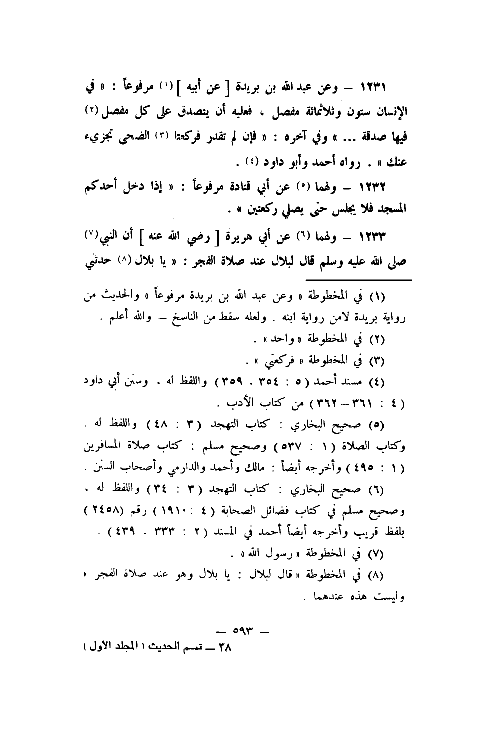 1231- وعن عبد الله بن بريدة [عن أبيه] 1 مرفوعاً: (في الإنسان ستون وثلاثمائة مفصل، فعليه أن يتصدق على كل مفصل 2 فيها صدقة (وفي آخره: (فإن لم تقدر فركعتا 3 الضحى تجزئ عنك) رواه أحمد وأبو داود4.