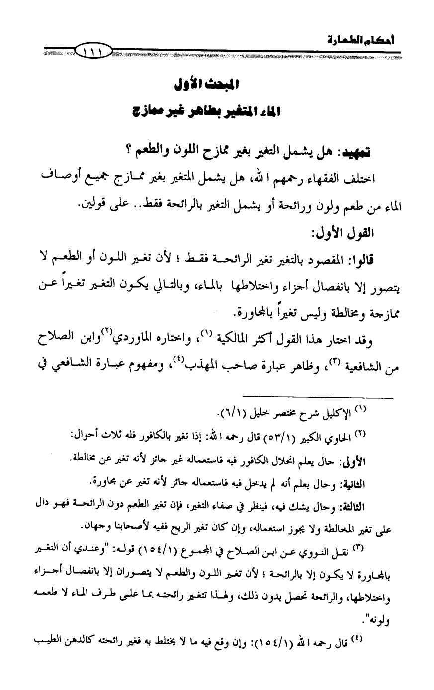 (¬٣) نقل النووي عن ابن الصلاح في المجموع (١/ ١٥٤) قوله: "وعندي أن التغير بالمجاورة لا يكون إلا بالرائحة؛ لأن تغير اللون والطعم لا يتصوران إلا بانفصال أجزاء واختلاطها، والرائحة تحصل بدون ذلك، ولهذا تتغير رائحته بما على طرف الماء لا طعمه ولونه ".