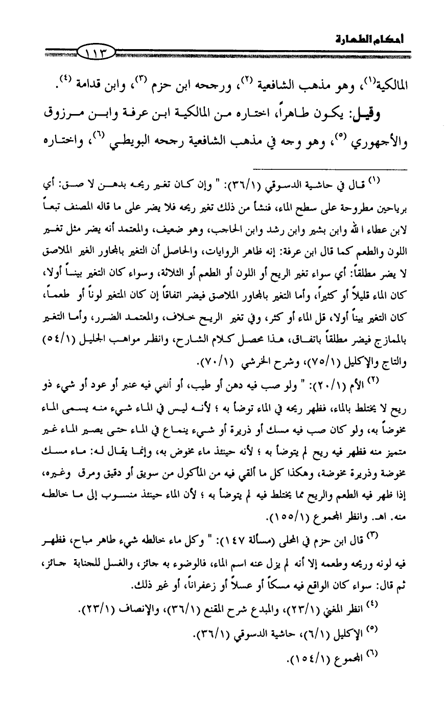 (¬٣) قال ابن حزم في المحلى (مسألة ١٤٧): " وكل ماء خالطه شيء طاهر مباح، فظهر فيه لونه وريحه وطعمه إلا أنه لم يزل عنه اسم الماء، فالوضوء به جائز، والغسل للجنابة جائز، ثم قال: سواء كان الواقع فيه مسكاً أو عسلاً أو زعفراناً، أو غير ذلك.