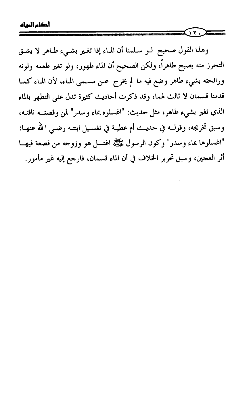 وهذا القول صحيح لو سلمنا أن الماء إذا تغير بشيء طاهر لا يشق التحرز منه يصبح طاهراً، ولكن الصحيح أن الماء طهور، ولو تغير طعمه ولونه ورائحته بشيء طاهر وضع فيه ما لم يخرج عن مسمى الماء، لأن الماء كما قدمنا قسمان لا ثالث لهما، وقد ذكرت أحاديث كثيرة تدل على التطهر بالماء الذي تغير بشيء طاهر، مثل حديث: "اغسلوه بماء وسدر" لمن وقصته ناقته، وسبق تخريجه، وقوله في حديث أم عطية في تغسيل ابنته رضي الله عنها: "اغسلوها بماء وسدر" وكون الرسول - صلى الله عليه وسلم - اغتسل هو وزوجه من قصعة فيها أثر العجين، وسبق تحرير الخلاف في أن الماء قسمان، فارجع إليه غير مأمور.