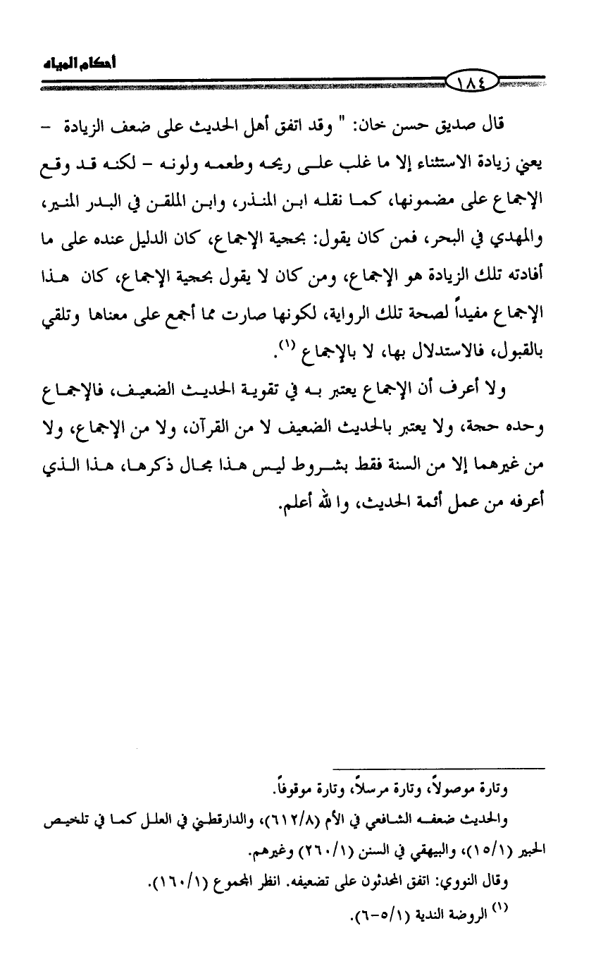 قال صديق حسن خان: " وقد اتفق أهل الحديث على ضعف الزيادة - يعني زيادة الاستثناء إلا ما غلب على ريحه وطعمه ولونه - لكنه قد وقع الإجماع على مضمونها، كما نقله ابن المنذر، وابن الملقن في البدر المنير، والمهدي في البحر، فمن كان يقول: بحجية الإجماع، كان الدليل عنده على ما أفادته تلك الزيادة هو الإجماع، ومن كان لا يقول بحجية الإجماع، كان هذا الإجماع مفيداً لصحة تلك الرواية، لكونها صارت مما أجمع على معناها وتلقي بالقبول، فالاستدلال بها، لا بالإجماع (¬١).
