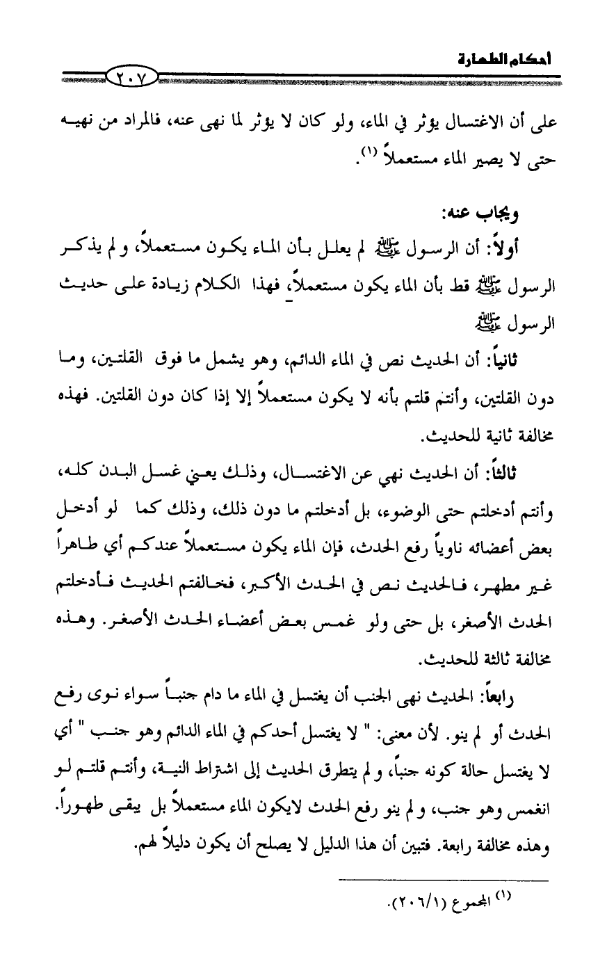 أولاً: أن الرسول - صلى الله عليه وسلم - لم يعلل بأن الماء يكون مستعملاً، ولم يذكر الرسول - صلى الله عليه وسلم - قط بأن الماء يكون مستعملاً، فهذا الكلام زيادة على حديث الرسول - صلى الله عليه وسلم -