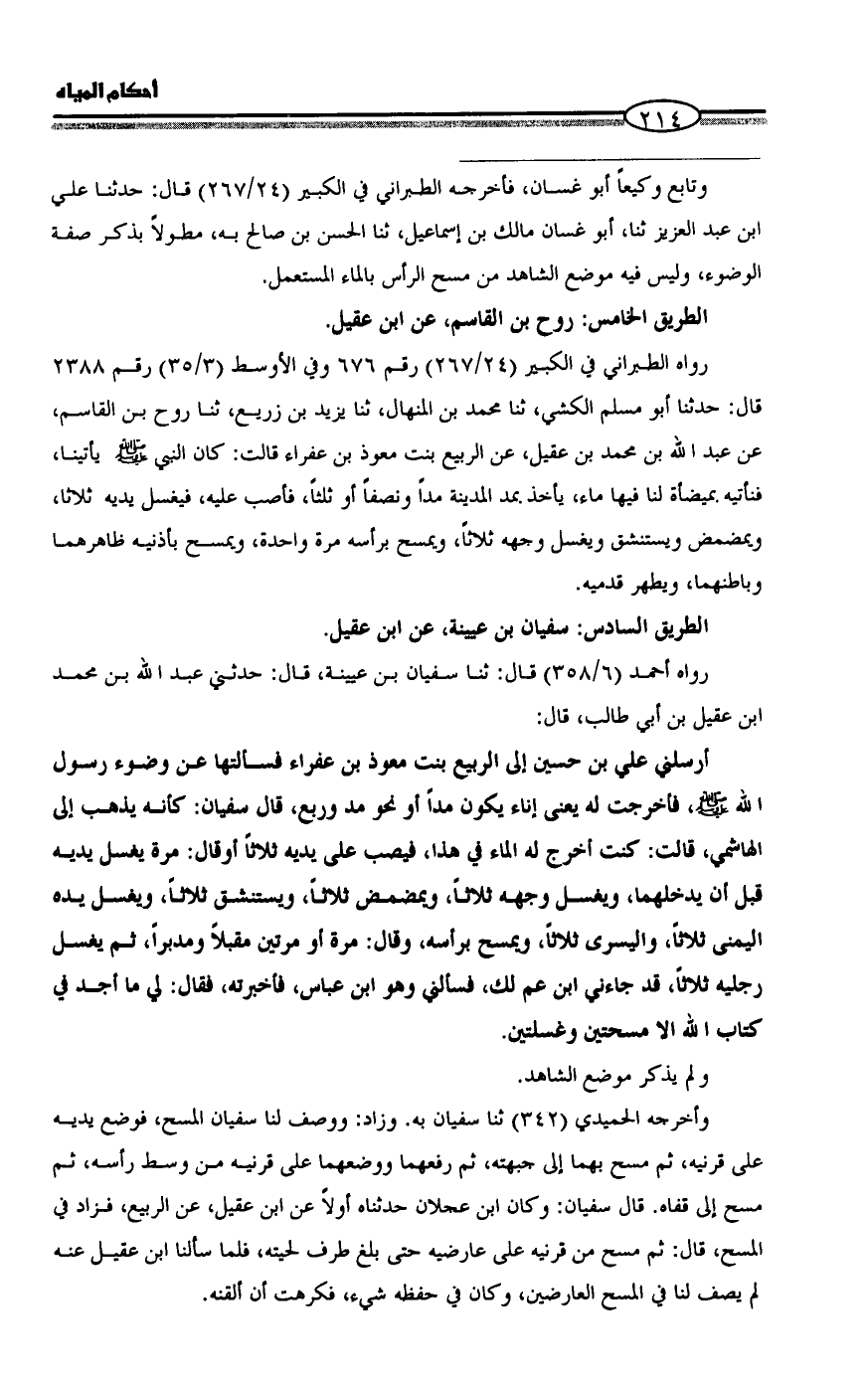 أرسلني علي بن حسين إلى الربيع بنت معوذ بن عفراء فسألتها عن وضوء رسول الله - صلى الله عليه وسلم -، فأخرجت له يعنى إناء يكون مداً أو نحو مد وربع، قال سفيان: كأنه يذهب إلى الهاشمي، قالت: كنت أخرج له الماء في هذا، فيصب على يديه ثلاثاً أوقال: مرة يغسل يديه قبل أن يدخلهما، ويغسل وجهه ثلاثاً، ويمضمض ثلاثاً، ويستنشق ثلاثاً، ويغسل يده اليمنى ثلاثاً، واليسرى ثلاثاً، ويمسح برأسه، وقال: مرة أو مرتين مقبلاً ومدبراً، ثم يغسل رجليه ثلاثاً، قد جاءني ابن عم لك، فسألني وهو ابن عباس، فأخبرته، فقال: لي ما أجد في كتاب الله الا مسحتين وغسلتين.