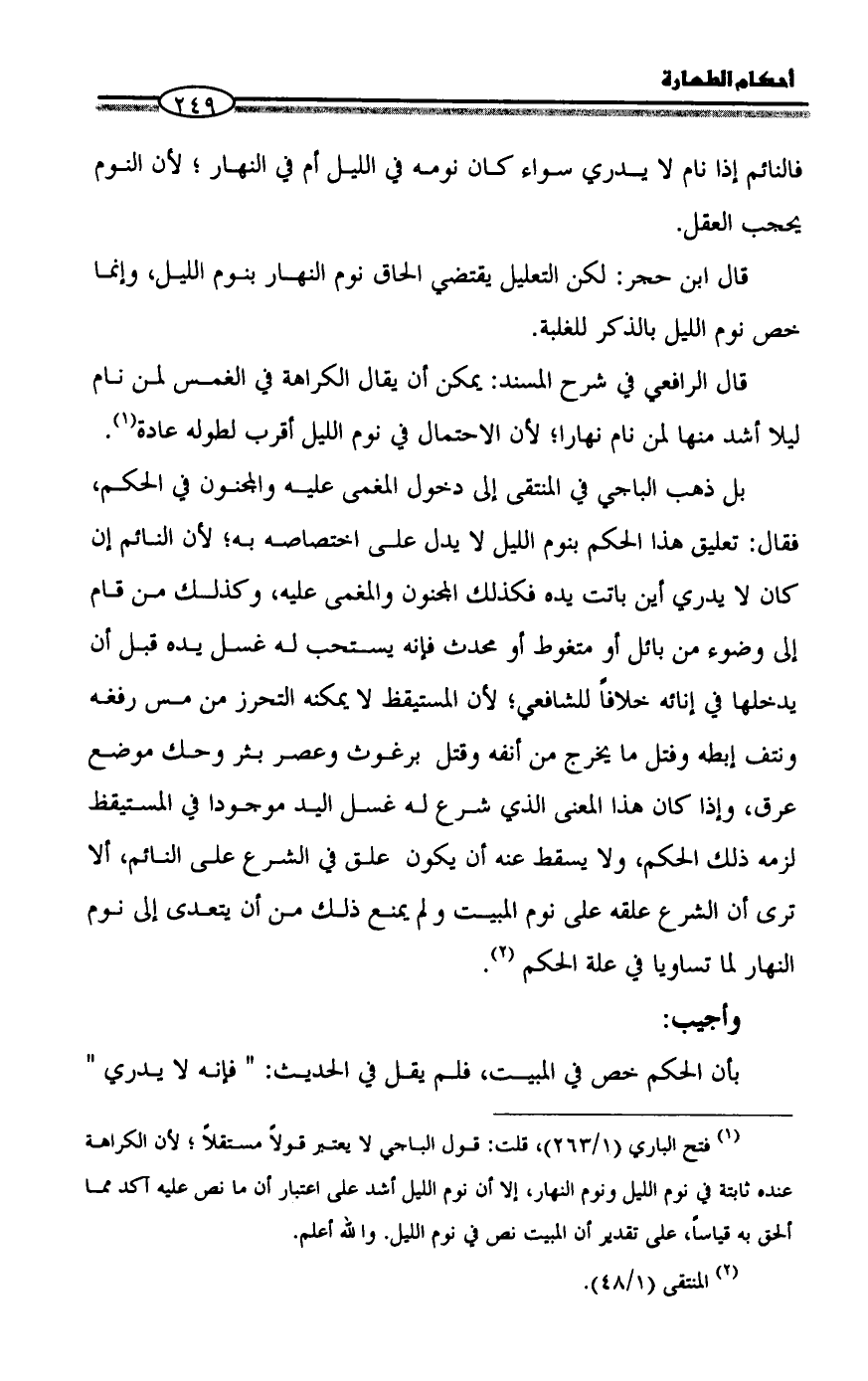 (¬١) فتح الباري (١/ ٢٦٣)، قلت: قول الباجي لا يعتبر قولاً مستقلاً؛ لأن الكراهة عنده ثابتة في نوم الليل ونوم النهار، إلا أن نوم الليل أشد على اعتبار أن ما نص عليه آكد مما ألحق به قياساً، على تقدير أن المبيت نص في نوم الليل. والله أعلم.