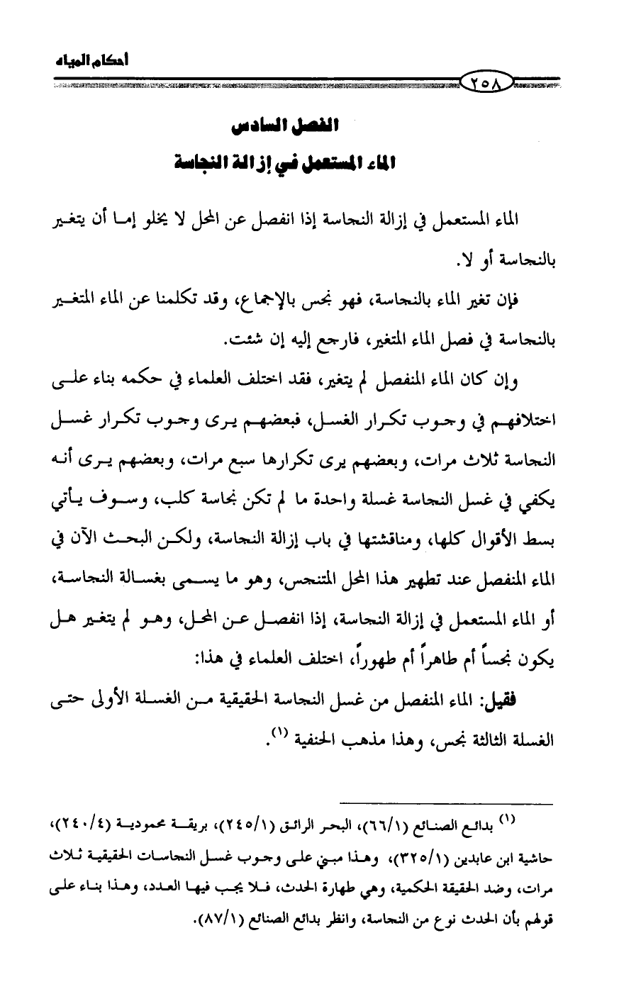 (¬١) بدائع الصنائع (١/ ٦٦)، البحر الرائق (١/ ٢٤٥)، بريقة محمودية (٤/ ٢٤٠)، حاشية ابن عابدين (١/ ٣٢٥)، وهذا مبني على وجوب غسل النجاسات الحقيقية ثلاث مرات، وضد الحقيقة الحكمية، وهي طهارة الحدث، فلا يجب فيها العدد، وهذا بناء على قولهم بأن الحدث نوع من النجاسة، وانظر بدائع الصنائع (١/ ٨٧).