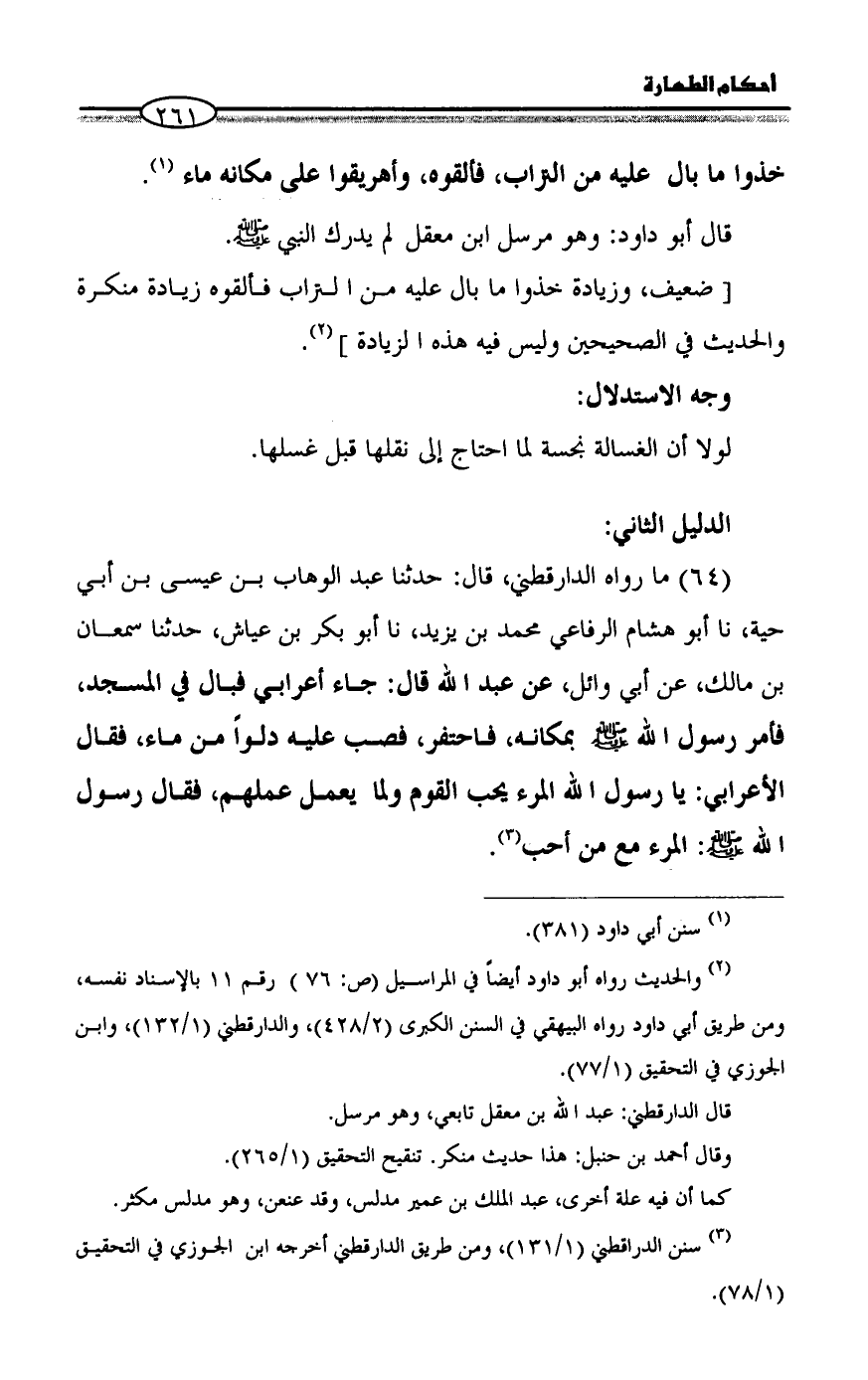 (٦٤) ما رواه الدارقطني، قال: حدثنا عبد الوهاب بن عيسى بن أبي حية، نا أبو هشام الرفاعي محمد بن يزيد، نا أبو بكر بن عياش، حدثنا سمعان بن مالك، عن أبي وائل، عن عبد الله قال: جاء أعرابي فبال في المسجد، فأمر رسول الله - صلى الله عليه وسلم - بمكانه، فاحتفر، فصب عليه دلواً من ماء، فقال الأعرابي: يا رسول الله المرء يحب القوم ولما يعمل عملهم، فقال رسول الله - صلى الله عليه وسلم -: المرء مع من أحب (¬٣).
