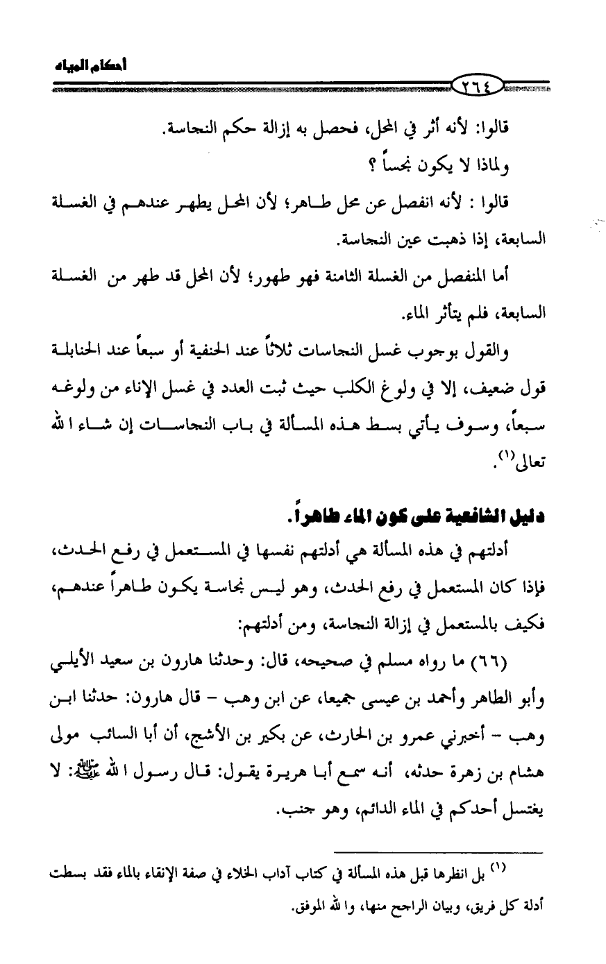 (٦٦) ما رواه مسلم في صحيحه، قال: وحدثنا هارون بن سعيد الأيلي وأبو الطاهر وأحمد بن عيسى جميعا، عن ابن وهب - قال هارون: حدثنا ابن وهب - أخبرني عمرو بن الحارث، عن بكير بن الأشج، أن أبا السائب مولى هشام بن زهرة حدثه، أنه سمع أبا هريرة يقول: قال رسول الله - صلى الله عليه وسلم -: لا يغتسل أحدكم في الماء الدائم، وهو جنب.